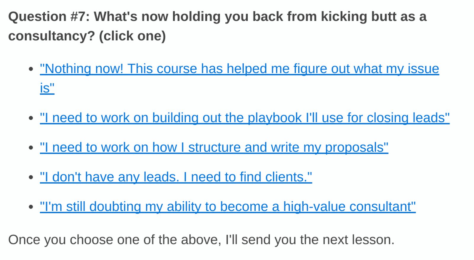 Brennan consegue saber em que um leitor está interessando segundo o link em que ele clica. Isso significa que ele sabe que dores e objeções enfatizar em seus emails. (Fonte: Brennan Dunn via GrowthLab)