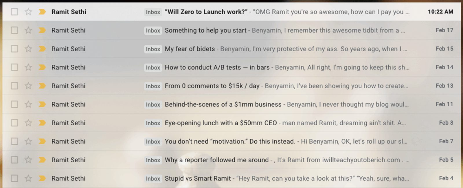 Seus contatos têm um problema. Aquilo que você vende resolve o problema deles.Mas ninguém vai comprar aquilo se não acreditar que é possível resolver o problema. É isso que esse email faz: mostra que existe uma resposta para o problema deles.Em outras palavras, ele move a pessoa de "consciente do problema" para "consciente do produto".Aqui está um exemplo desse estilo de email, do Ramit Sethi:
