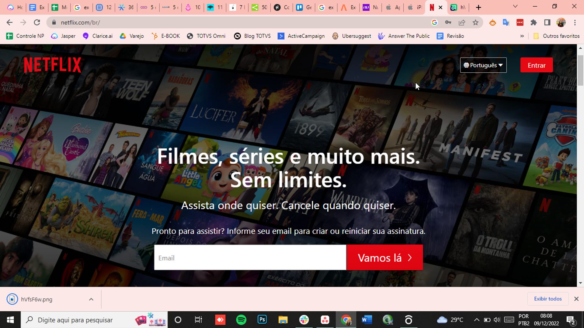 A página inicial da Netflix também aposta em uma linguagem simples e objetiva, porque já tem um mercado muito forte pelo seu pioneirismo. Além disso, destaca suas grandes vantagens: é possível assistir em qualquer lugar e, ainda, desistir do plano quando quiser.