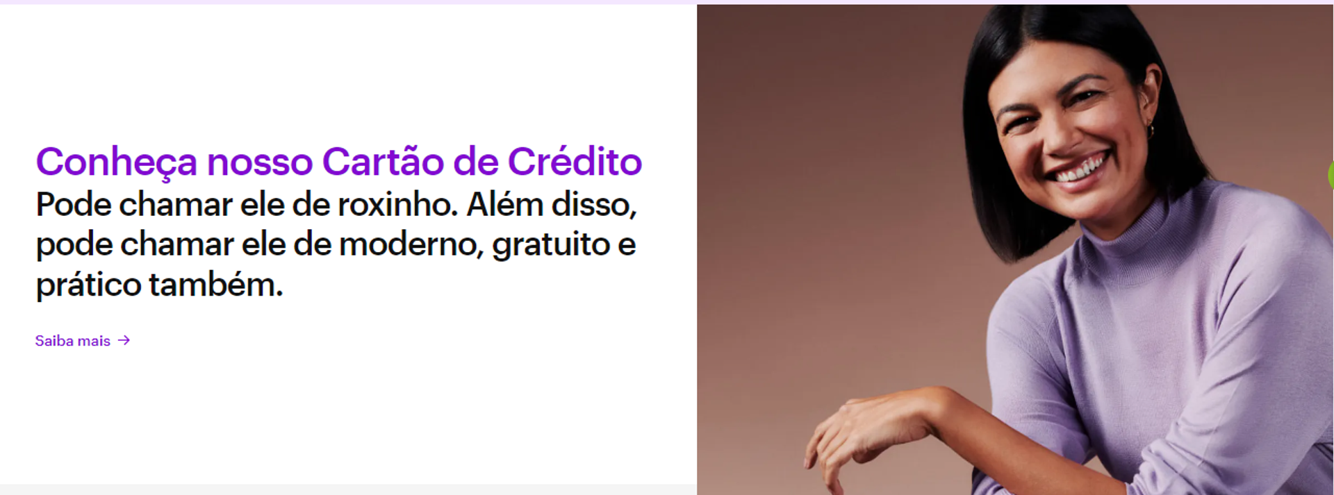 Em um copy sobre a modalidade de crédito, a empresa convida a pessoa leitora a chamar o cartão de “roxinho”, sem deixar de mostrar seus diferenciais. Veja como ficou: