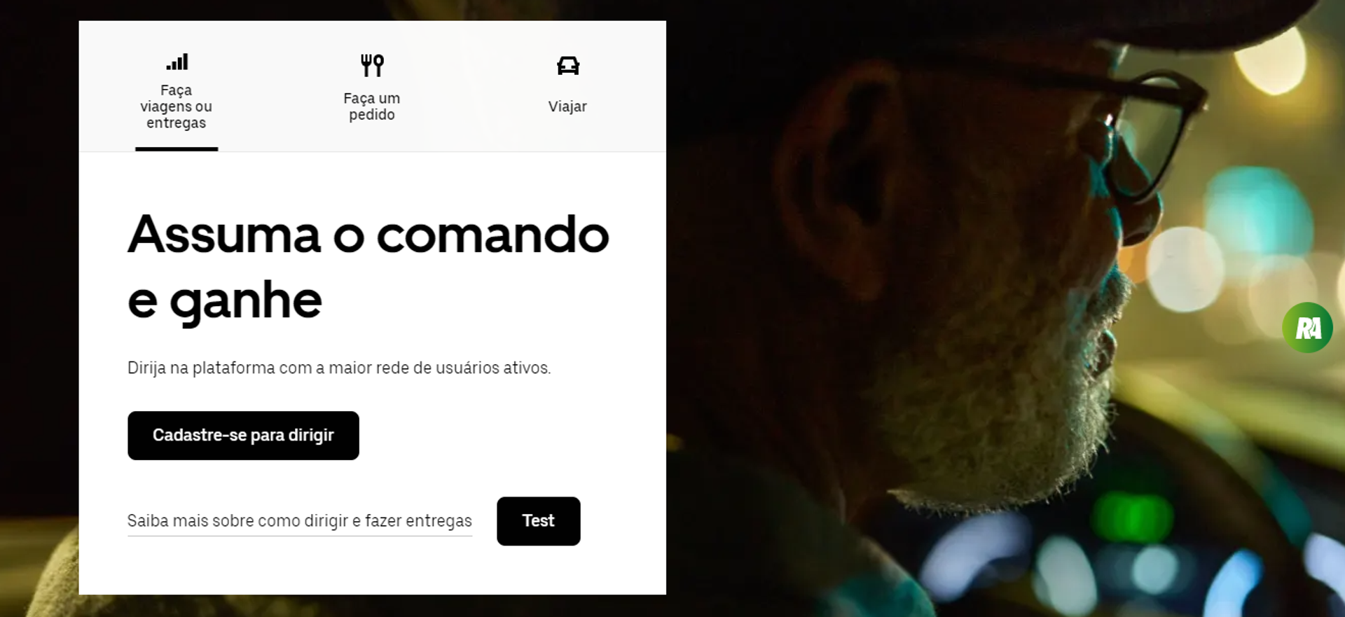Na página inicial da Uber, ela explora bastante as palavras no presente — e no imperativo — para dar força ao serviço que entrega: "assuma o comando e ganhe”.