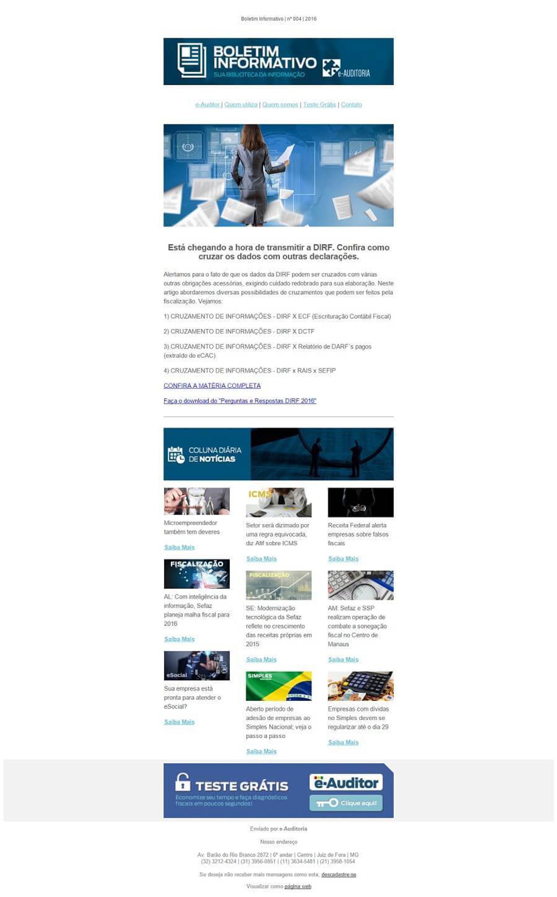 Um ótimo exemplo de email informativo de marketing é esse do e-Auditor. O site compila um boletim informativo, com as notícias mais importantes do setor onde atua.