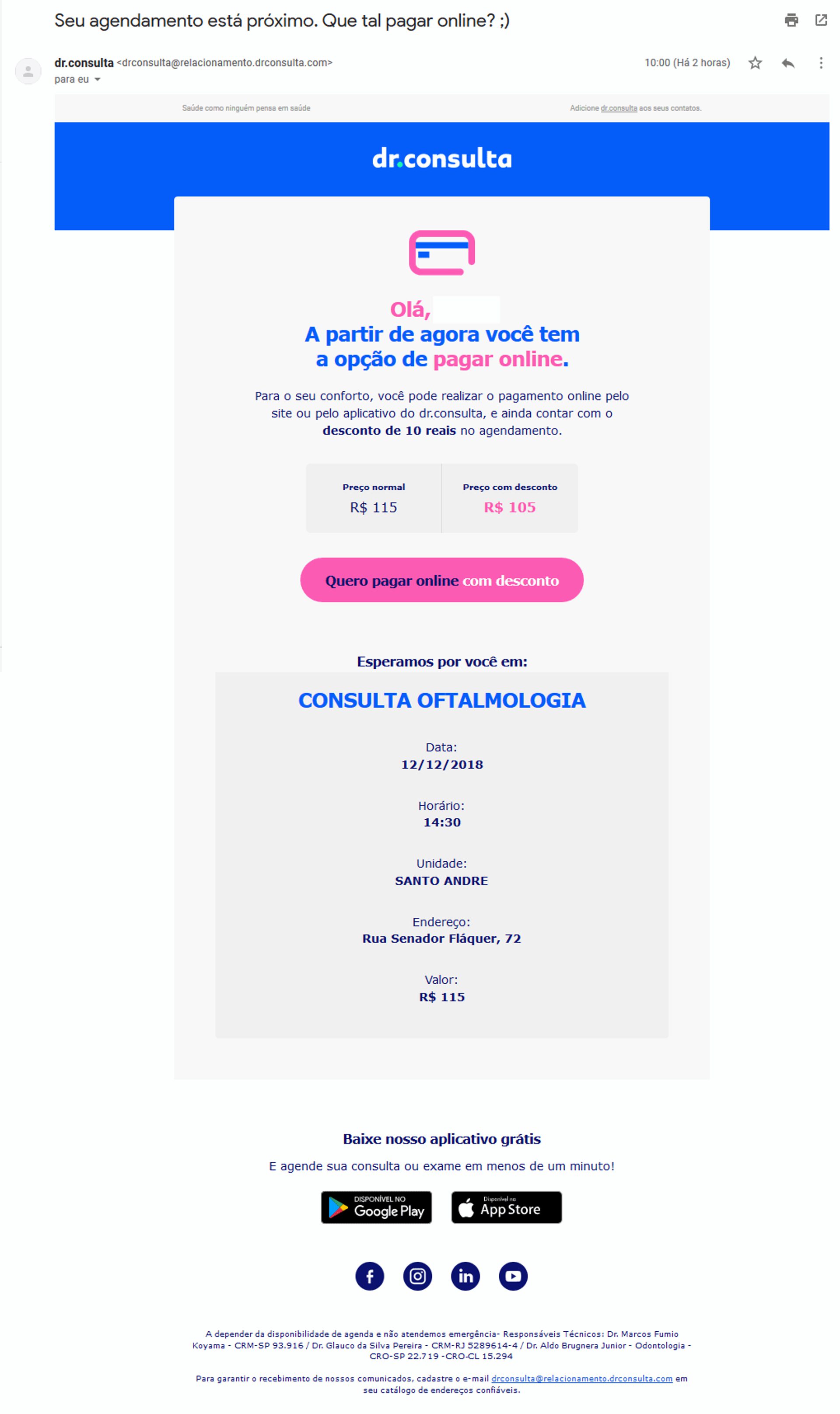 Fechando nossa lista de exemplos de email marketing, temos um email de confirmação de consulta agendada que vai mais longe do que sua função transacional. Ele oferece ao leitor a oportunidade de ganhar um desconto no valor da consulta ao realizar o pagamento online.