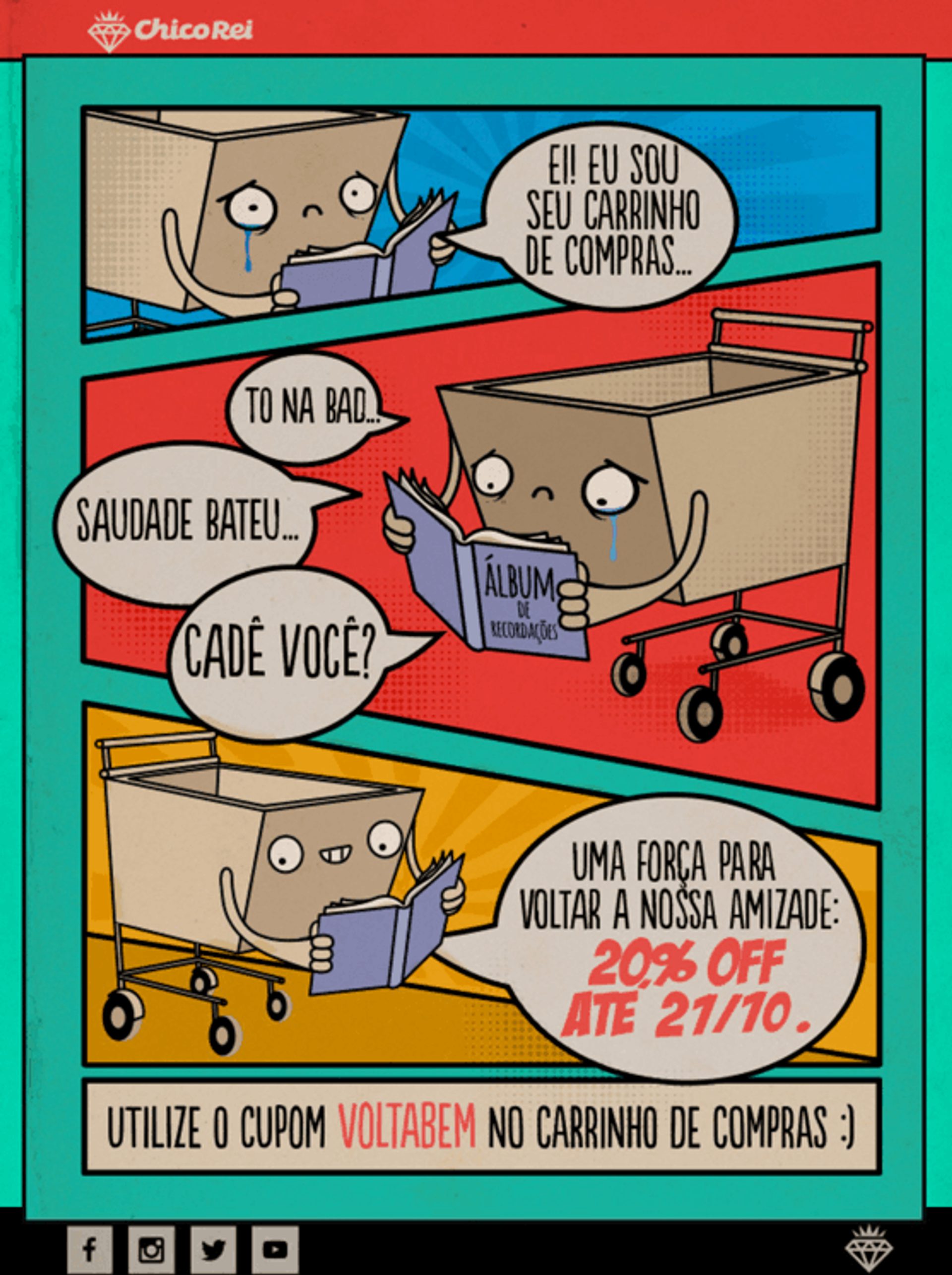 Outro exemplo de email marketing criativo em forma de quadrinhos foi feito pela equipe do Chico Rei. A mensagem é enviada para clientes que não fazem compra há algum tempo, oferecendo um desconto especial.
