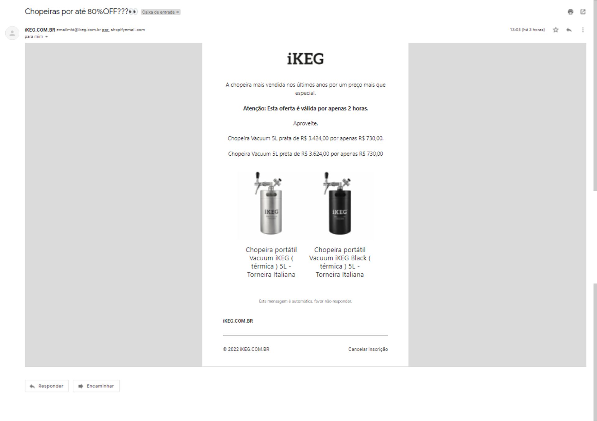 Note que a promoção dura as duas horas seguintes ao envio do email. Nesse formato, aparece novamente o senso de urgência, ao avisar o leitor que a oferta acaba logo.