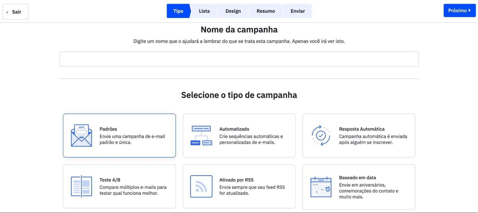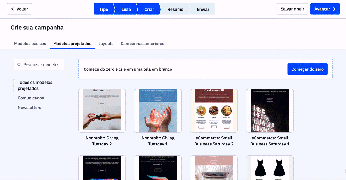 Depois de escolher o tipo da campanha e a lista de contatos que será usada, você será direcionado para nossa galeria de modelos.