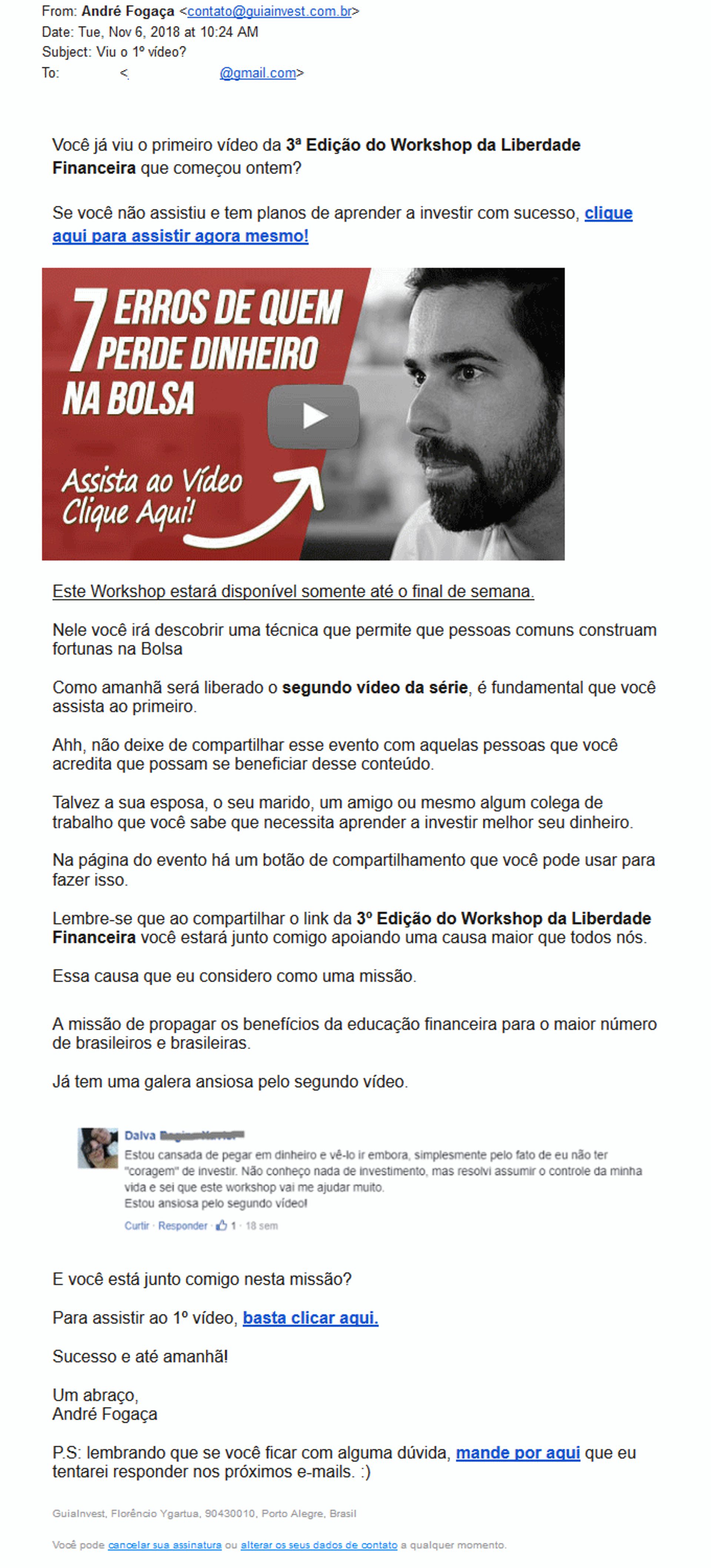 Um exemplo de email marketing criativo é da Guia Invest. A empresa caprichou nessa newsletter, feita para divulgar o primeiro vídeo em uma série informativa gravada em um Workshop.