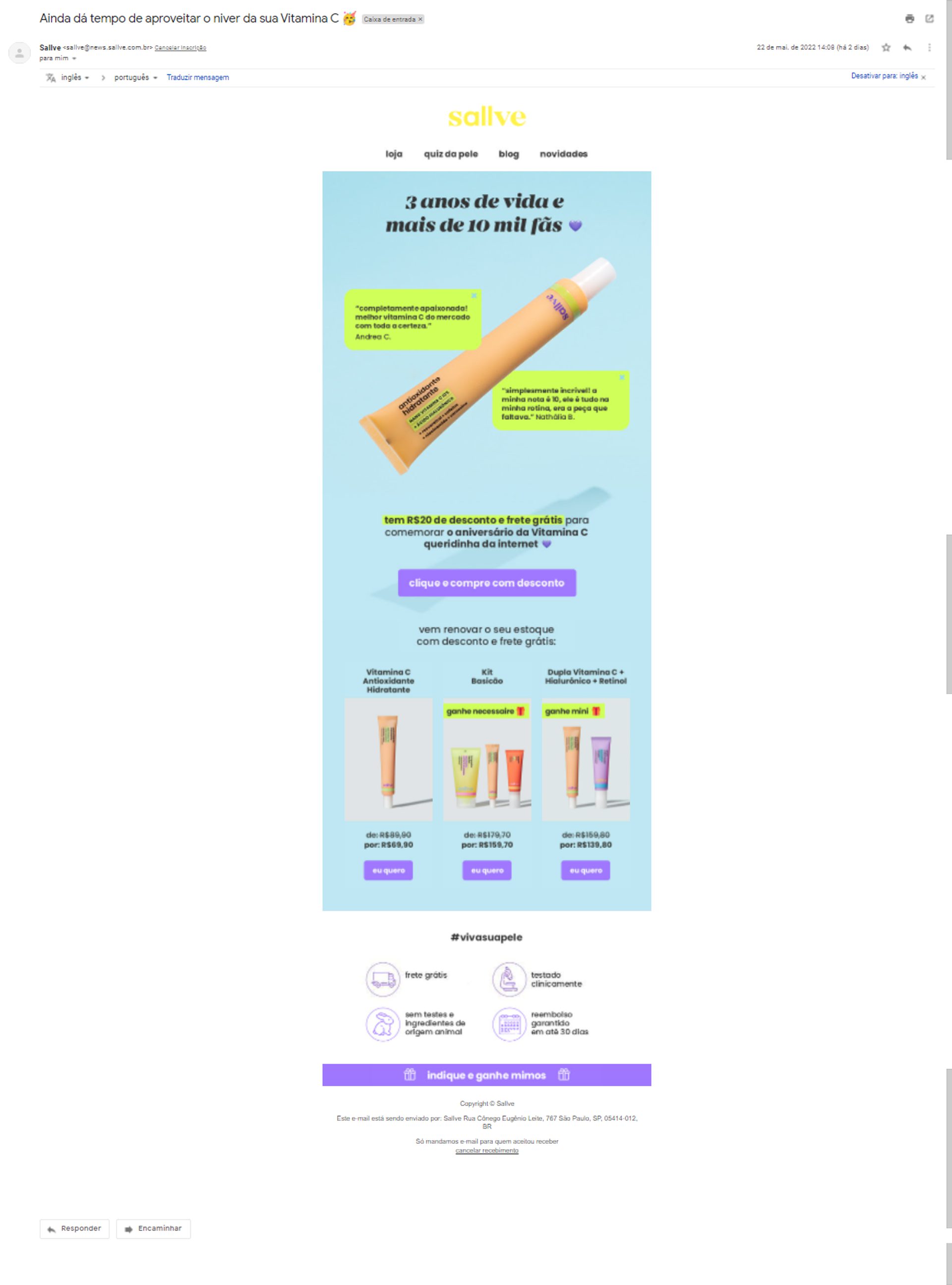Esse é um email marketing (exemplo) da marca Sallve. Trata-se de um tipo de email relacionado à comemoração, nesse caso, de 3 anos do produto da marca.