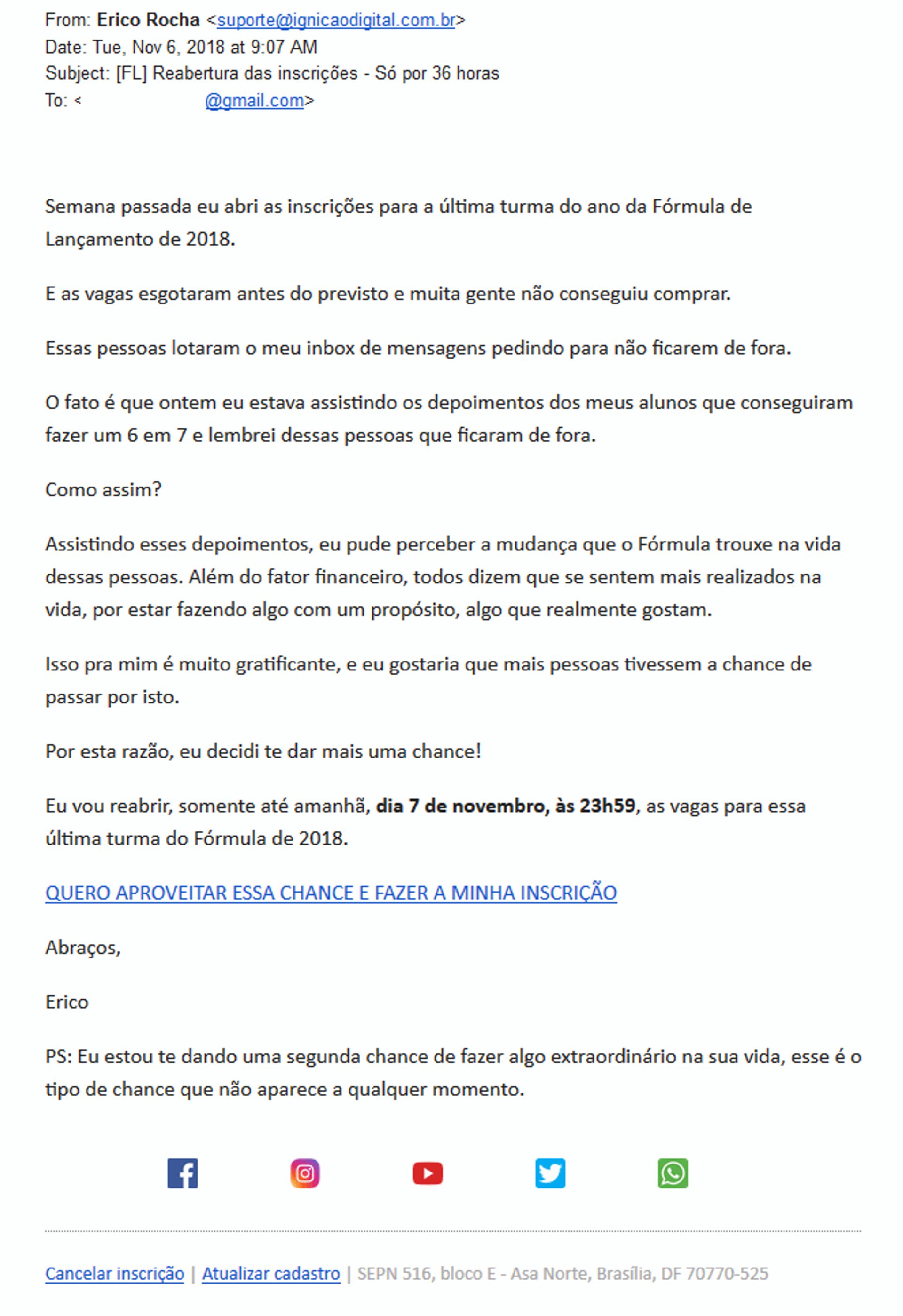 - senso de urgência: você precisa se inscrever antes que as vagas acabem. Em adição, as inscrições só serão aceitas até o dia seguinte;