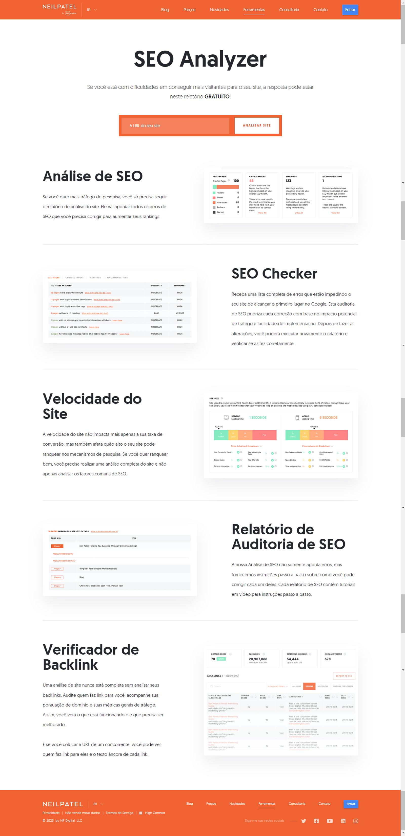 A ferramenta Ubersuggest, da agência de marketing de Neil Patel, é um ótimo exemplo desse tipo de isca digital, permitindo criar uma conta gratuita para fazer análise do SEO do site.