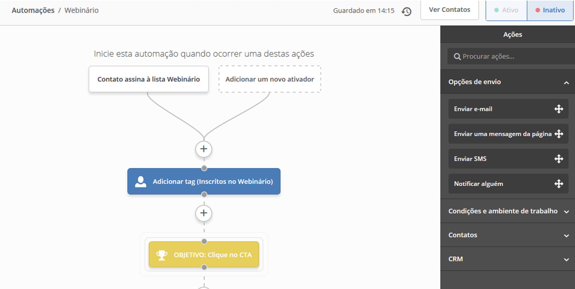 Veja a seguir um exemplo de assistente para criação, automação e gestão de negócios da ActiveCampaign: