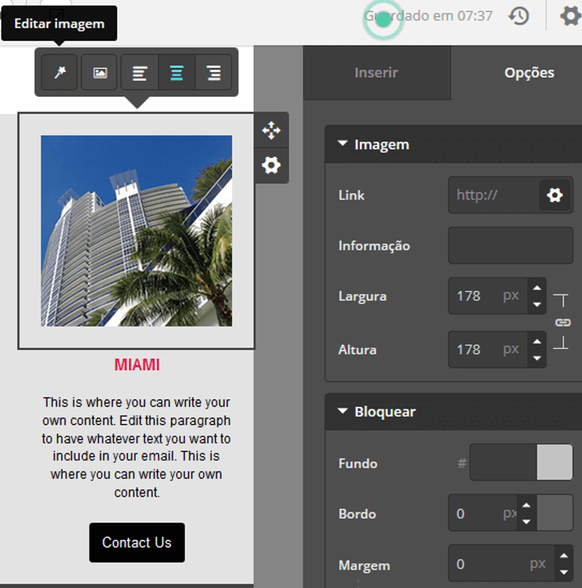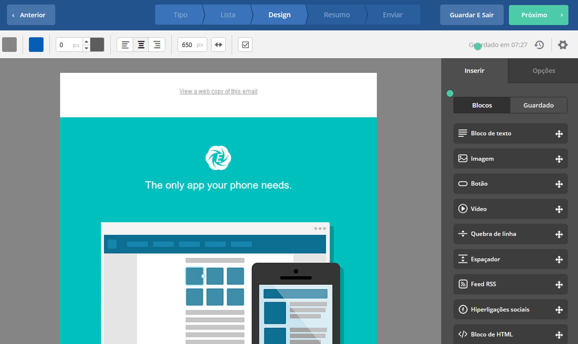 Veja a seguir uma imagem mostrando todas as funcionalidades do editor de templates da ActiveCampaign: