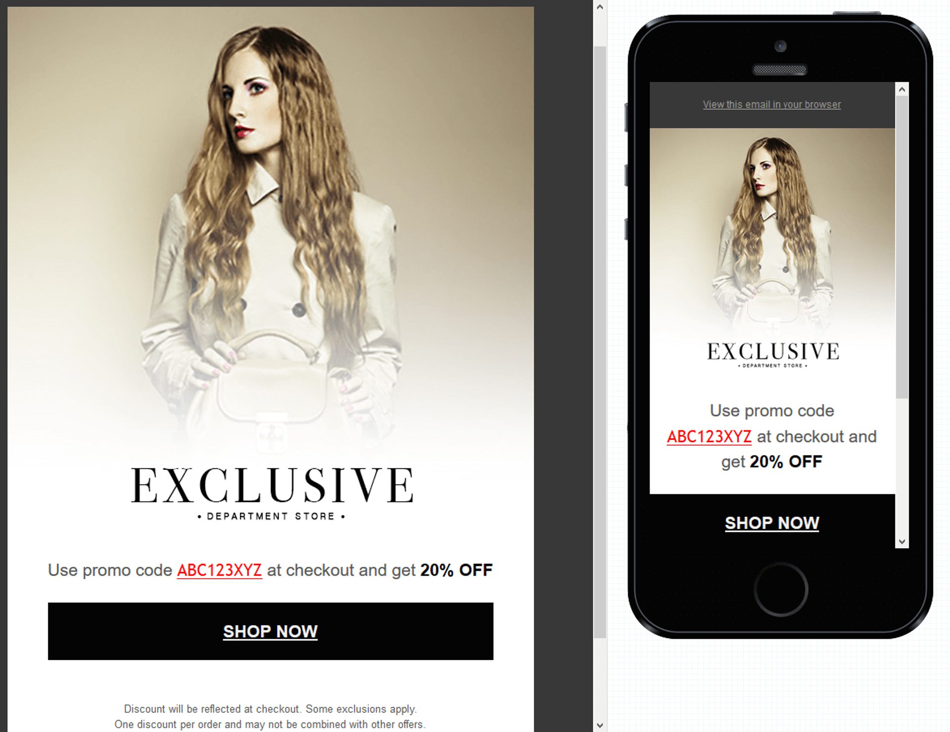 Nesse caso, em vez de promover produtos específicos, o modelo de email marketing oferece um código de desconto e o link no call to action leva ao site da loja, incentivando a audiência em potencial a procurar produtos que correspondam ao seu desejo de compra.