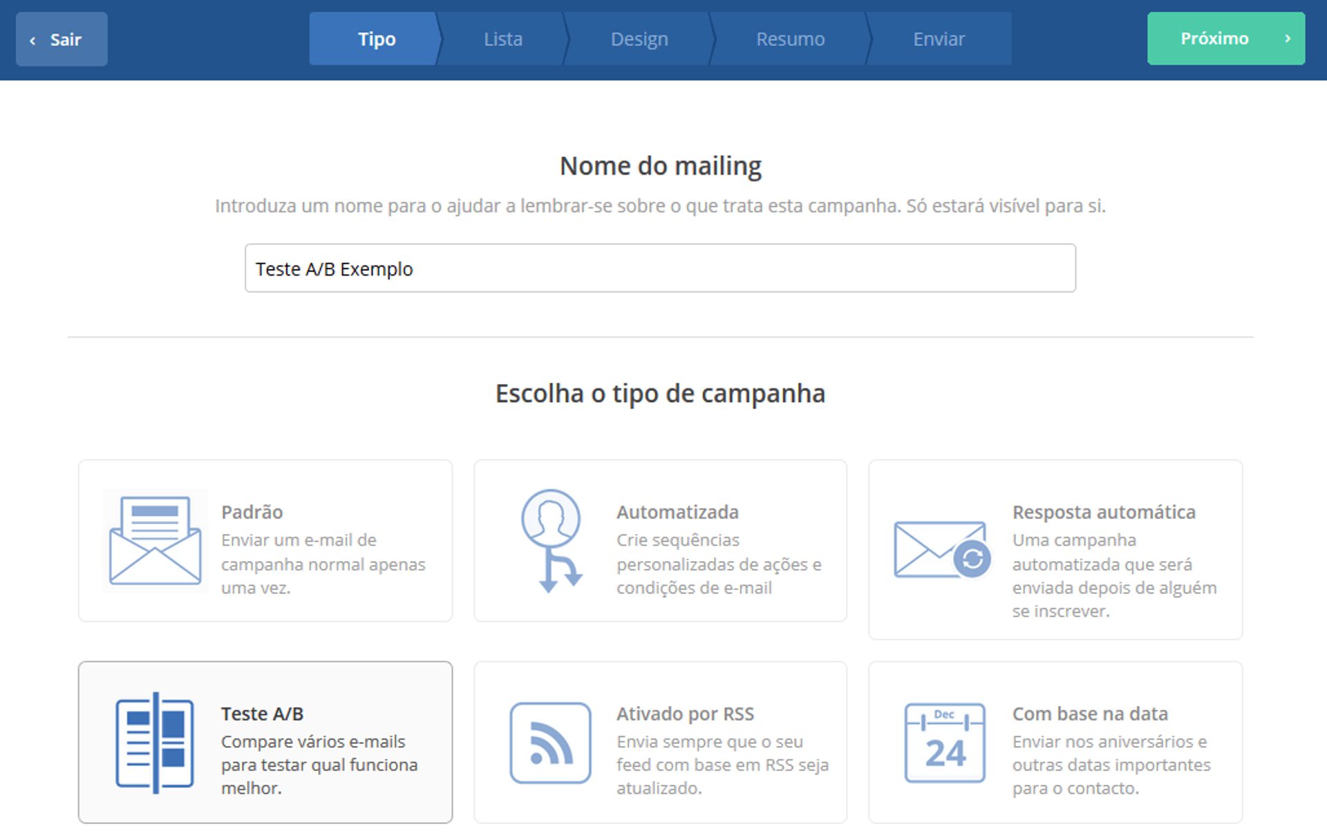 Uma das opções permite o envio de versões do teste para pequenos grupos da sua lista de contatos. Depois de alguns dias, a plataforma determina automaticamente qual versão foi mais eficiente. A “vencedora” é, então, enviada para o restante da sua lista.