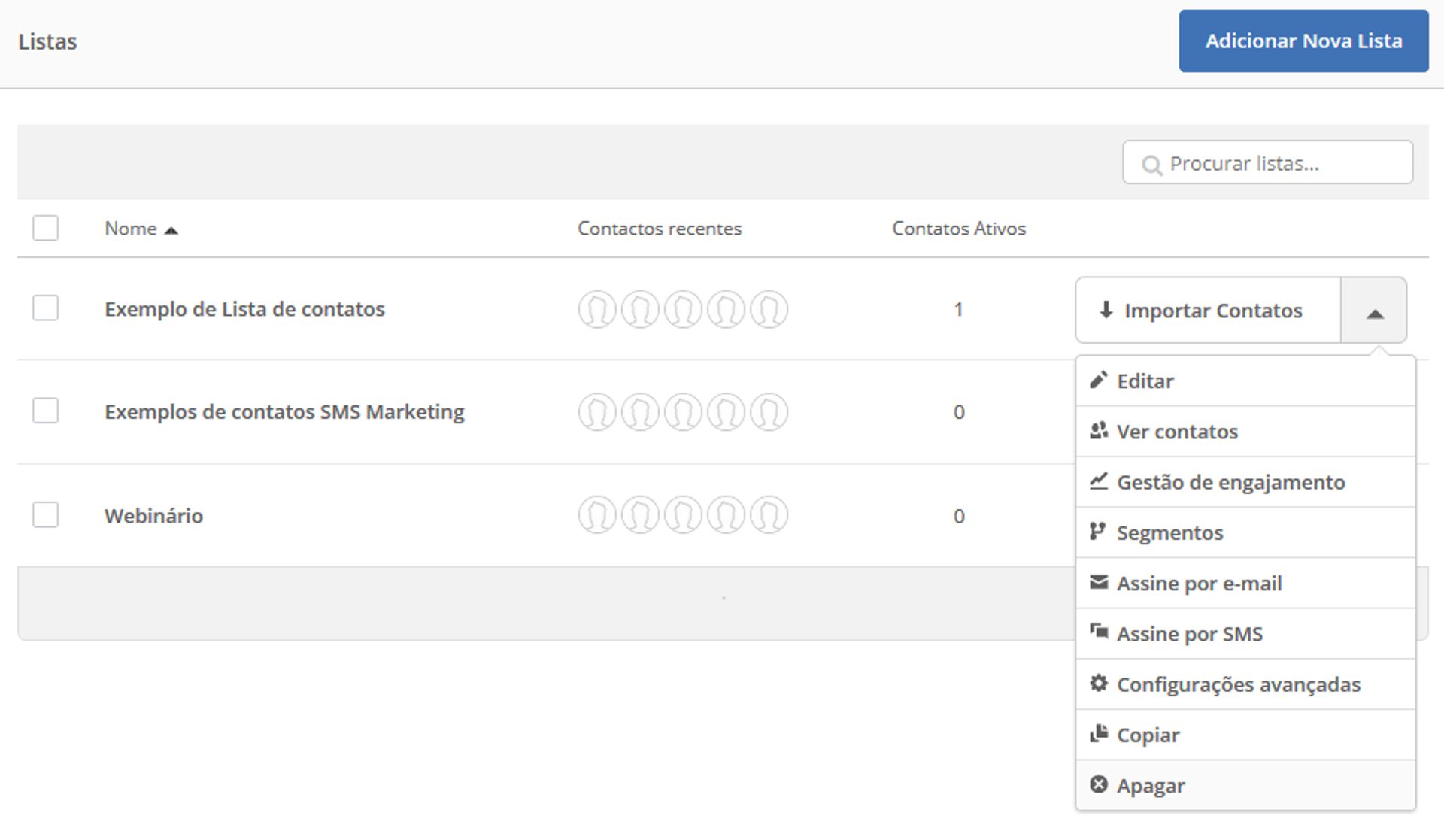 No exemplo abaixo, você pode ver como funciona a gestão de contatos na ActiveCampaign: