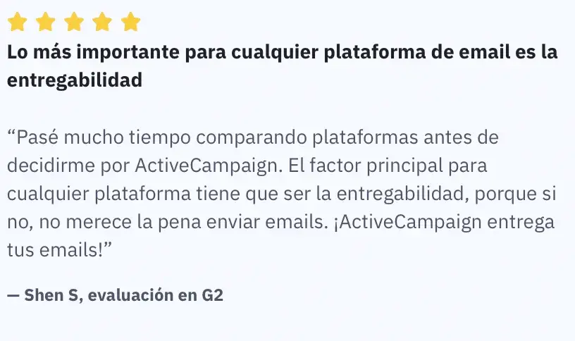 Reseña cinco estrellas sobre ActiveCampaign en G2. Fuente: ActiveCampaign.