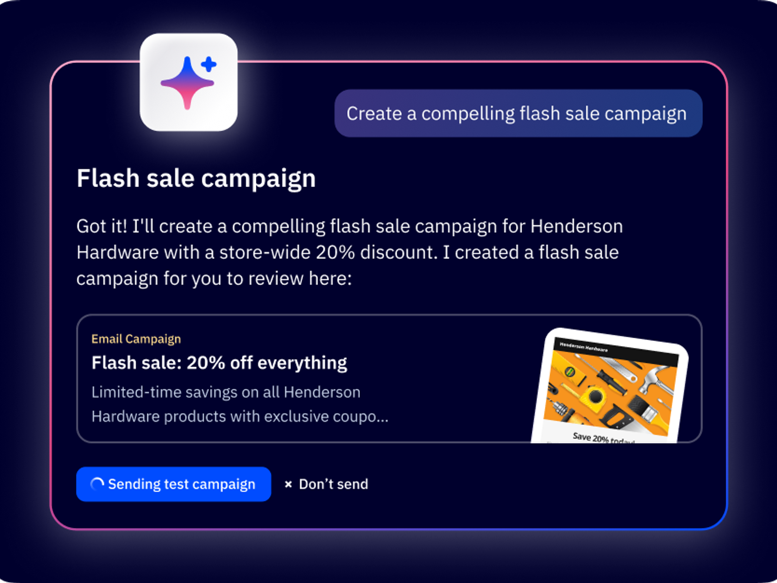 Our autonomous marketing platform handles your marketing–including email campaigns, SMS messages, WhatsApp chats, and more–but instead of you doing all the work, Active Intelligence guides your strategy and handles the heavy lifting. You focus on your business goals while AI agents imagine, activate, and validate your marketing for you.