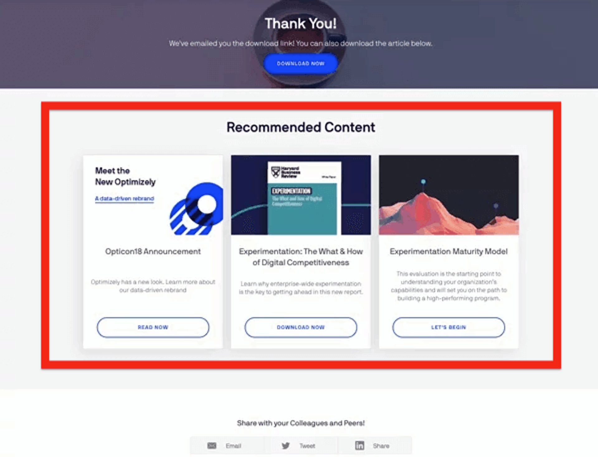 This thank-you page from Optimizely appears after a visitor submits a form for a content download.