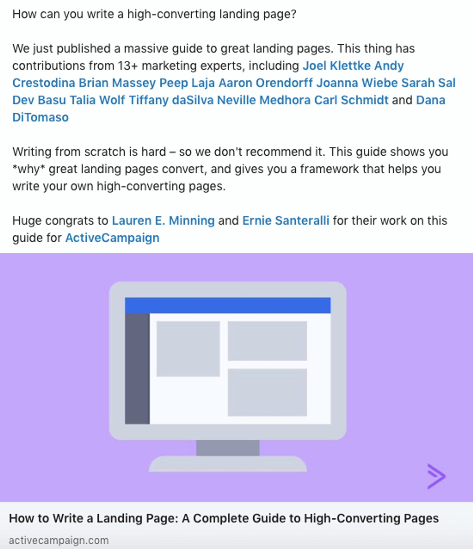 This LinkedIn social post about high-converting landing pages promotes highly useful content You can create a landing page for content like this and make it gated.