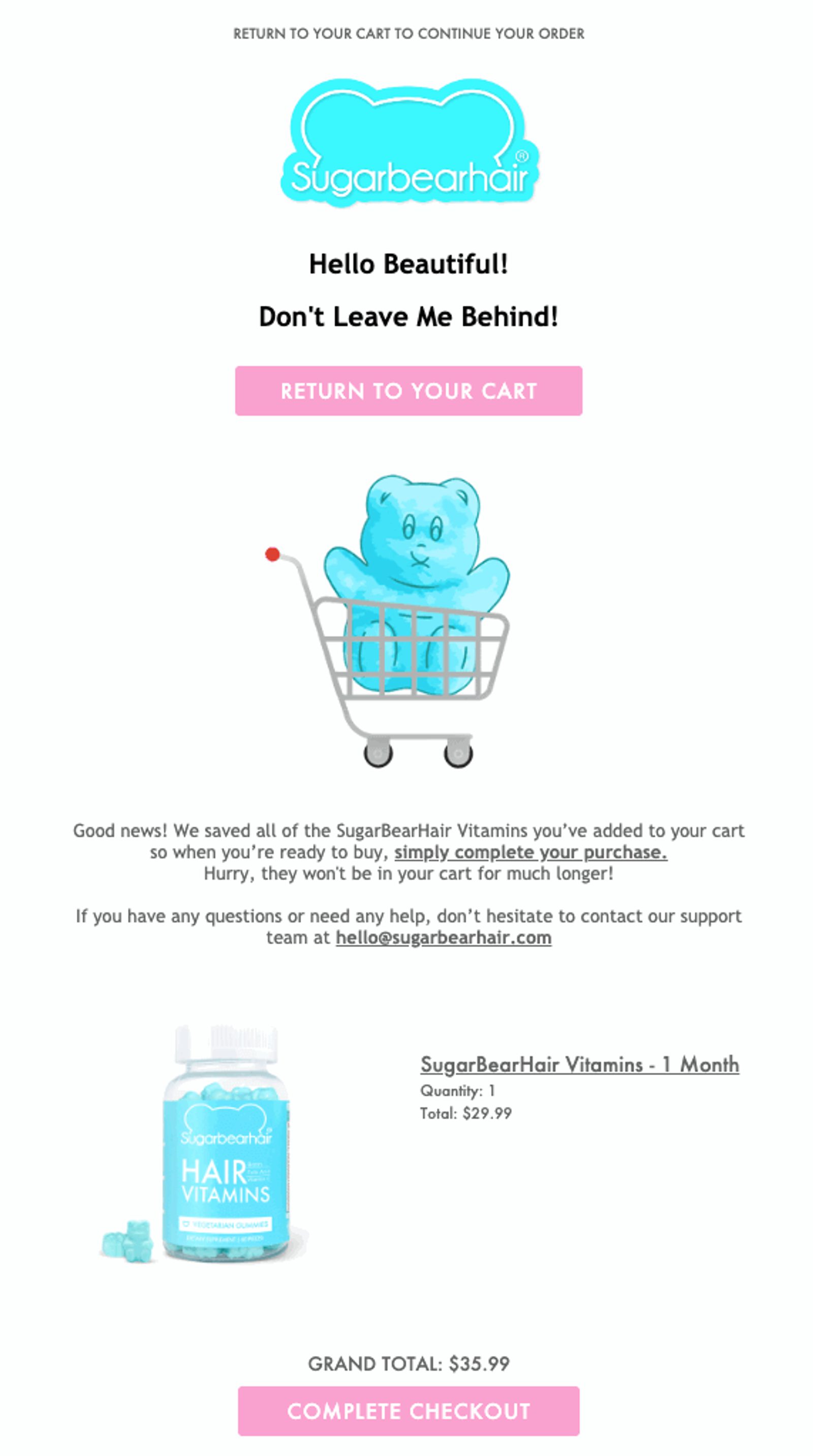 What’s not to love? We can clearly see that this recovery email’s focus simply reminds us that we forgot our shopping cart. No more, no less.