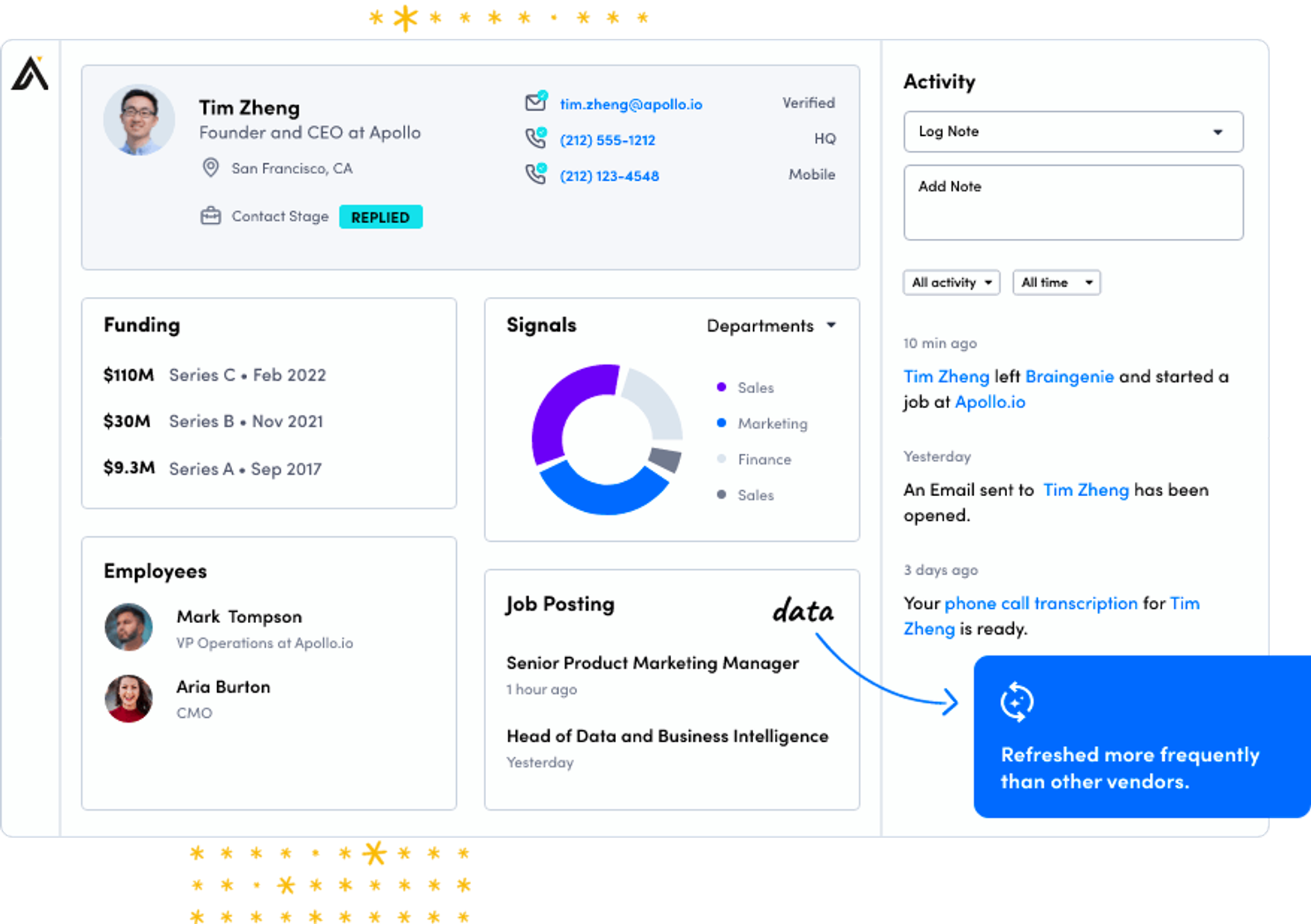 One of your existing accounts is Oracle, for whom Robert Fox is the key contact and decision-maker. Apollo.io tracks media updates and learns that Mr. Fox has just become the CRO at Google, a company that’s not yet a client, but you would love to turn into one.