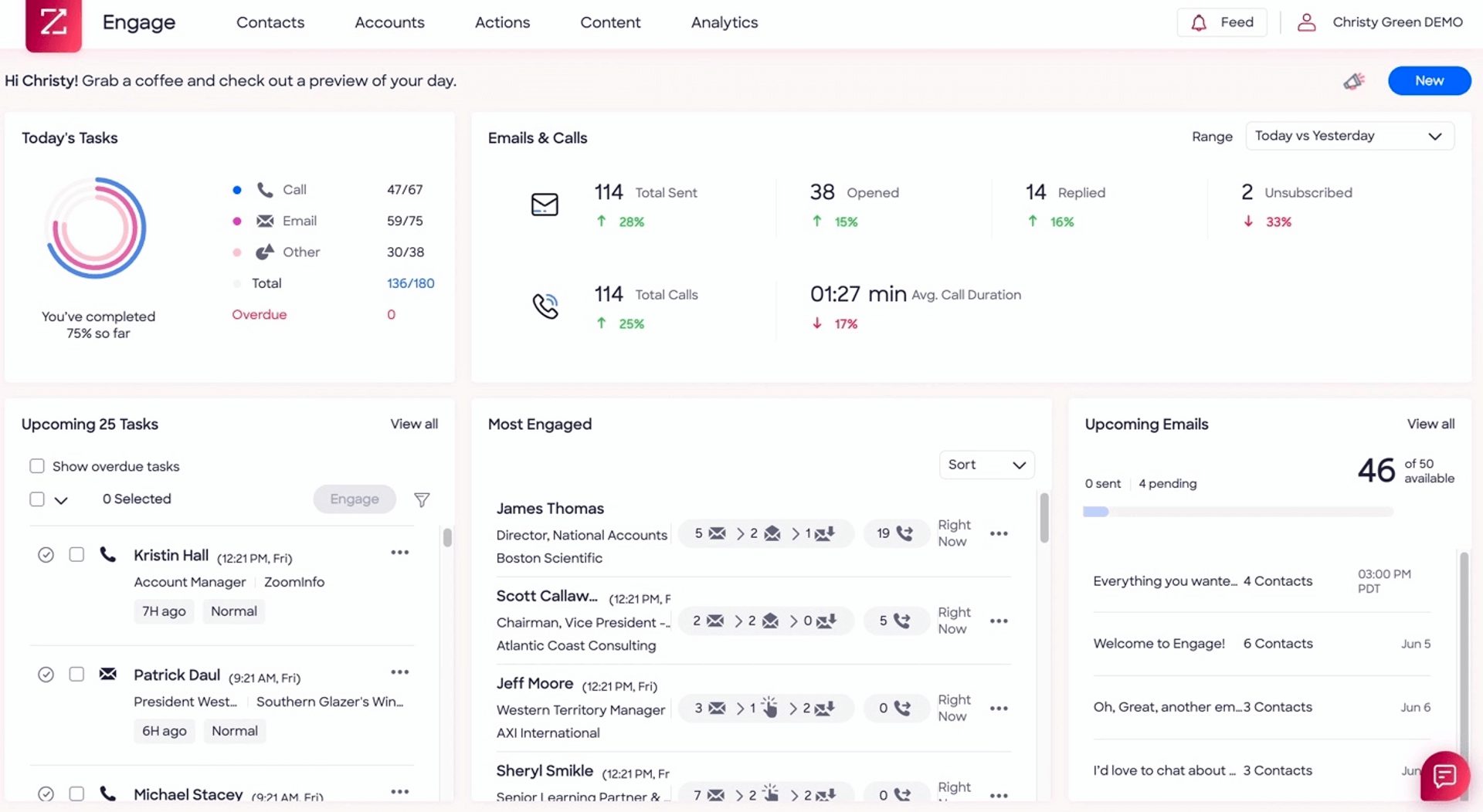For example, this screenshot of a dashboard in Engage (a product by ZoomInfo) demonstrates how sales engagement software gives sales teams a to-do list of daily tasks and insights into their performance that day. It also lists their most active accounts so revenue teams can capitalize on the strongest opportunities.