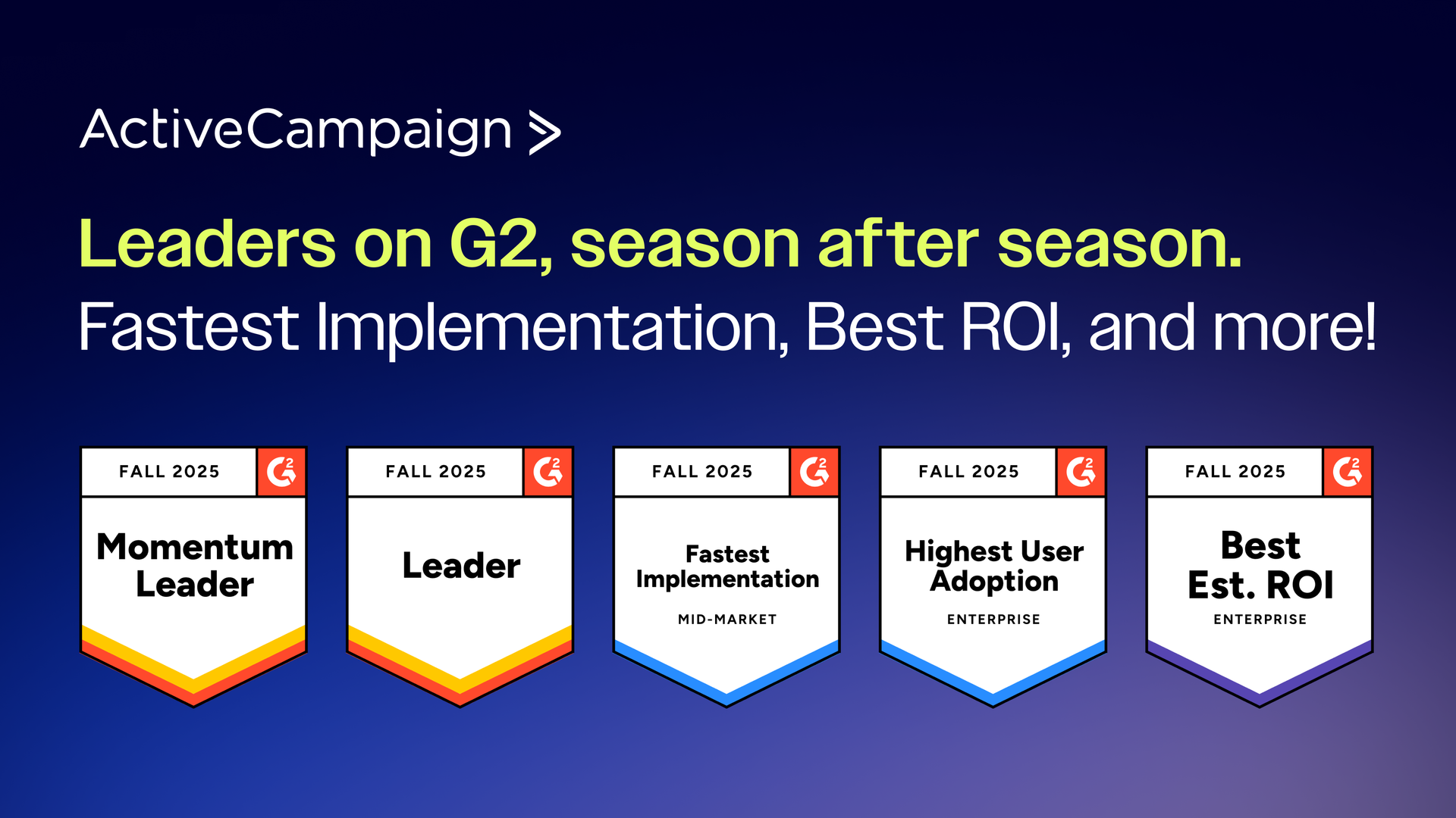 We are proud to announce that ActiveCampaign has once again been recognized as a leader in G2’s Fall 2025 reports. This cycle, we earned 322 badges, ranked #1 in 77 reports, and were in the Top 3 for 208 reports.