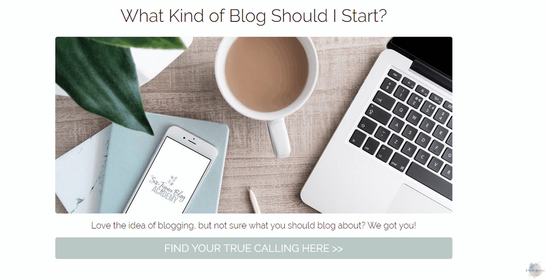 The quiz identifies one of six different blog types that the quiz-taker should start. People end up with results such as mommy blogger, lifestyle blogger, travel blogger, business blogger, food blogger, and wellness blogger.