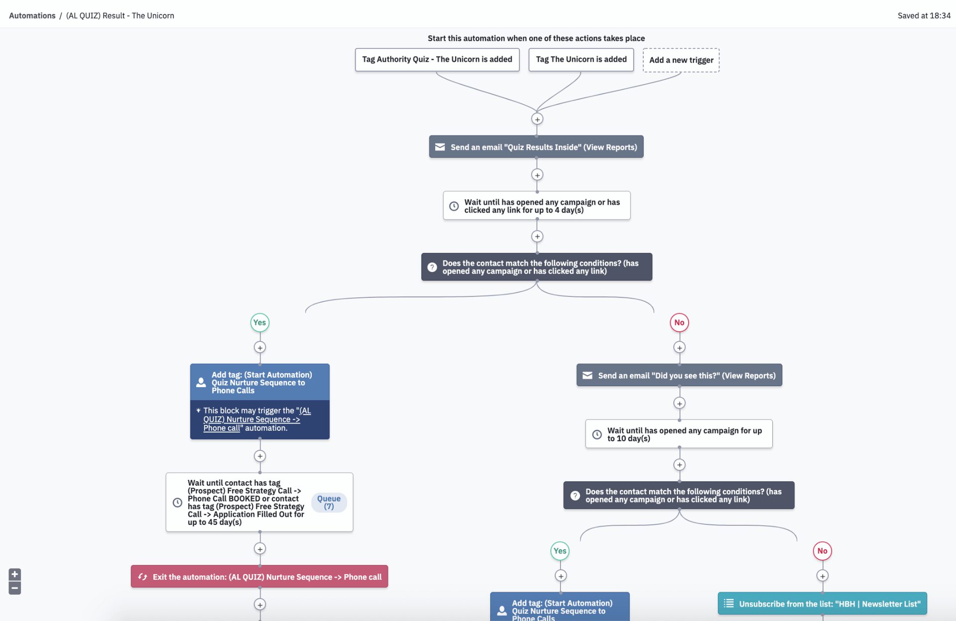 Notice how she set up an automation to move her subscribers through her funnel towards becoming her coaching clients. The automation also has conditions based on subscriber behavior.
