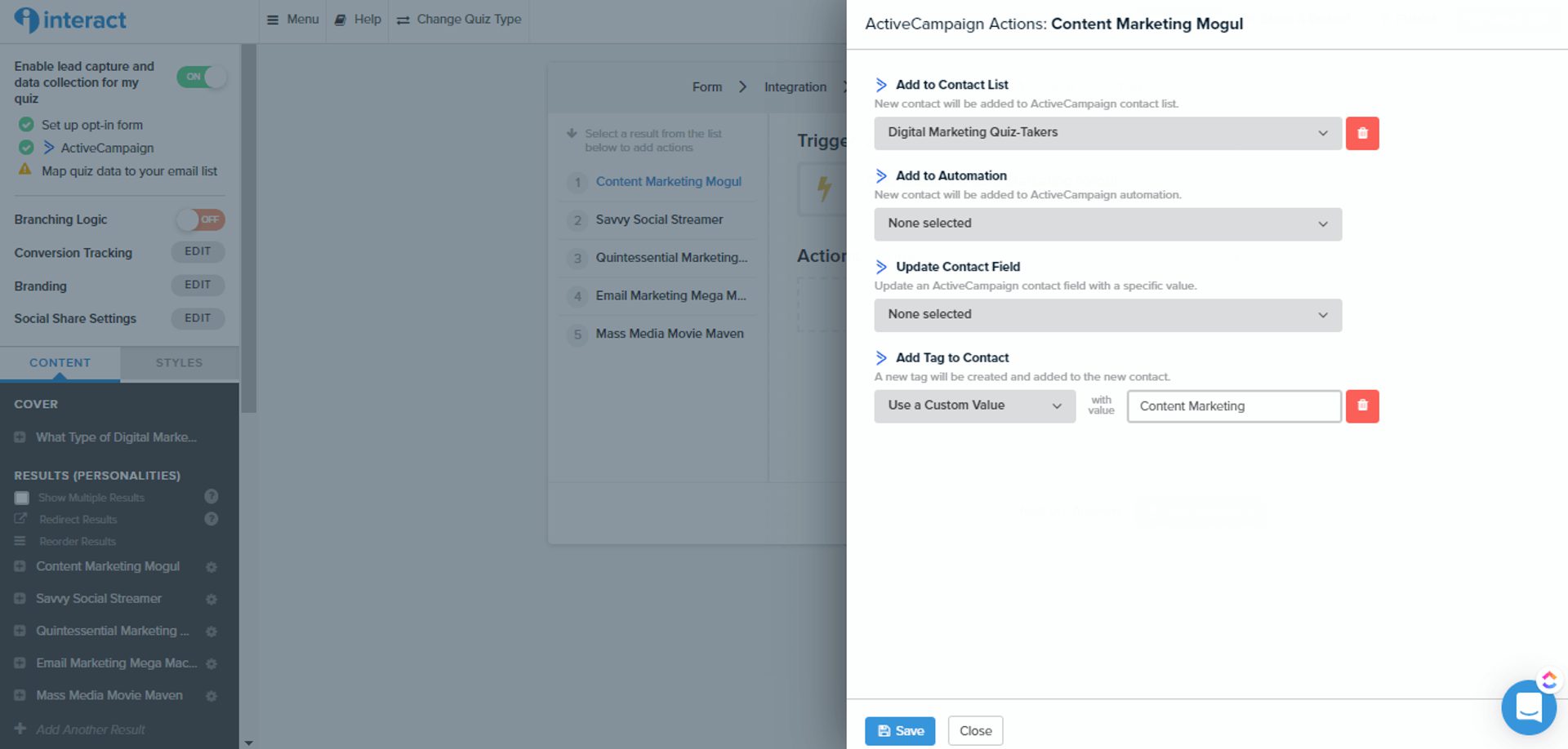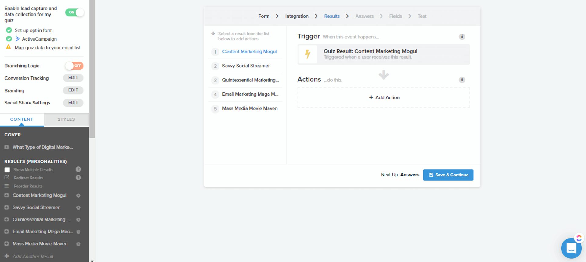 Once that’s done, you’re ready to set up the Interact triggers and ActiveCampaign actions for each of your quiz results.