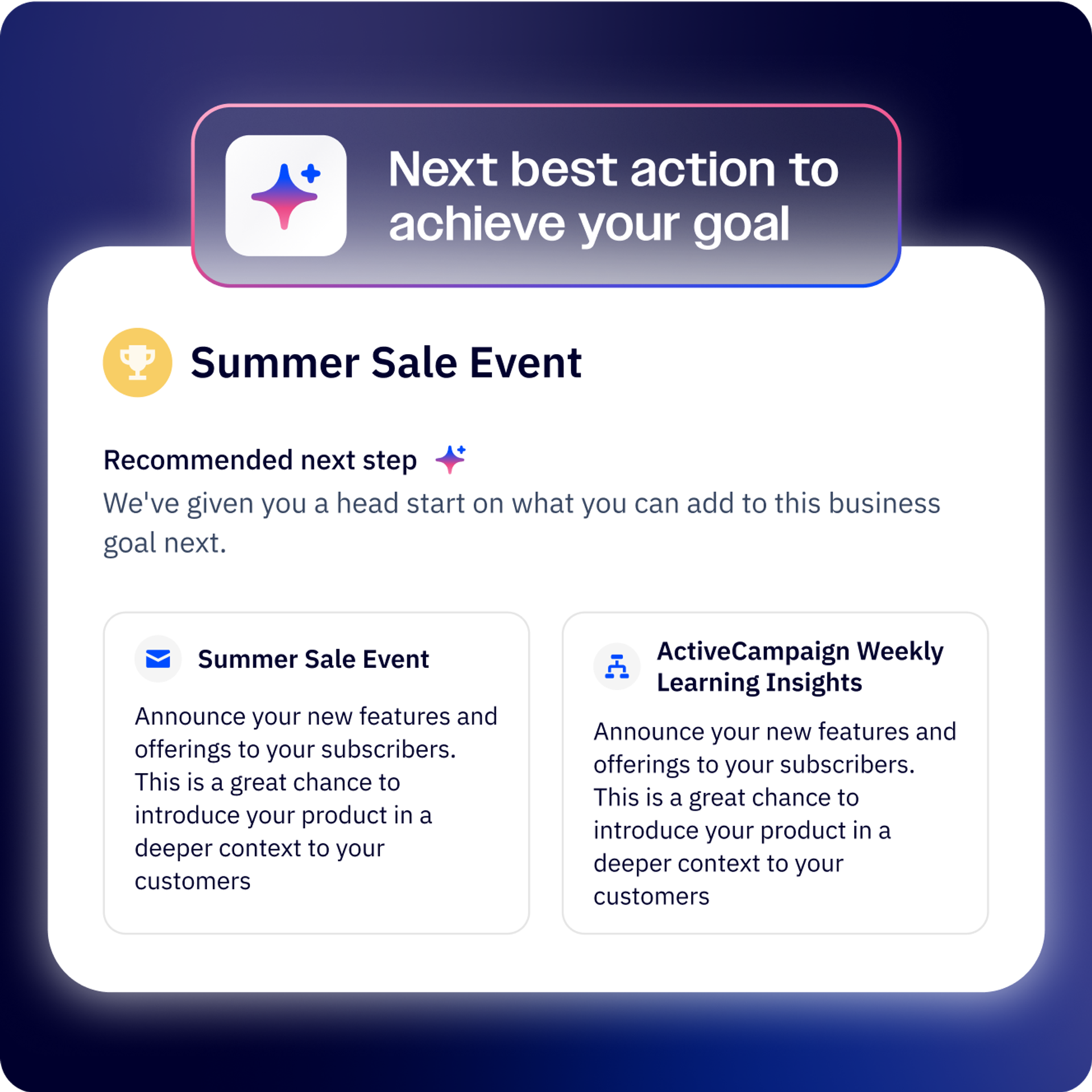 Here's where it gets powerful: Active Intelligence generates goals, custom conversions, and the supporting marketing assets you need—campaigns, automations, forms—in seconds. No more building everything from scratch or guessing which activities will move the needle.