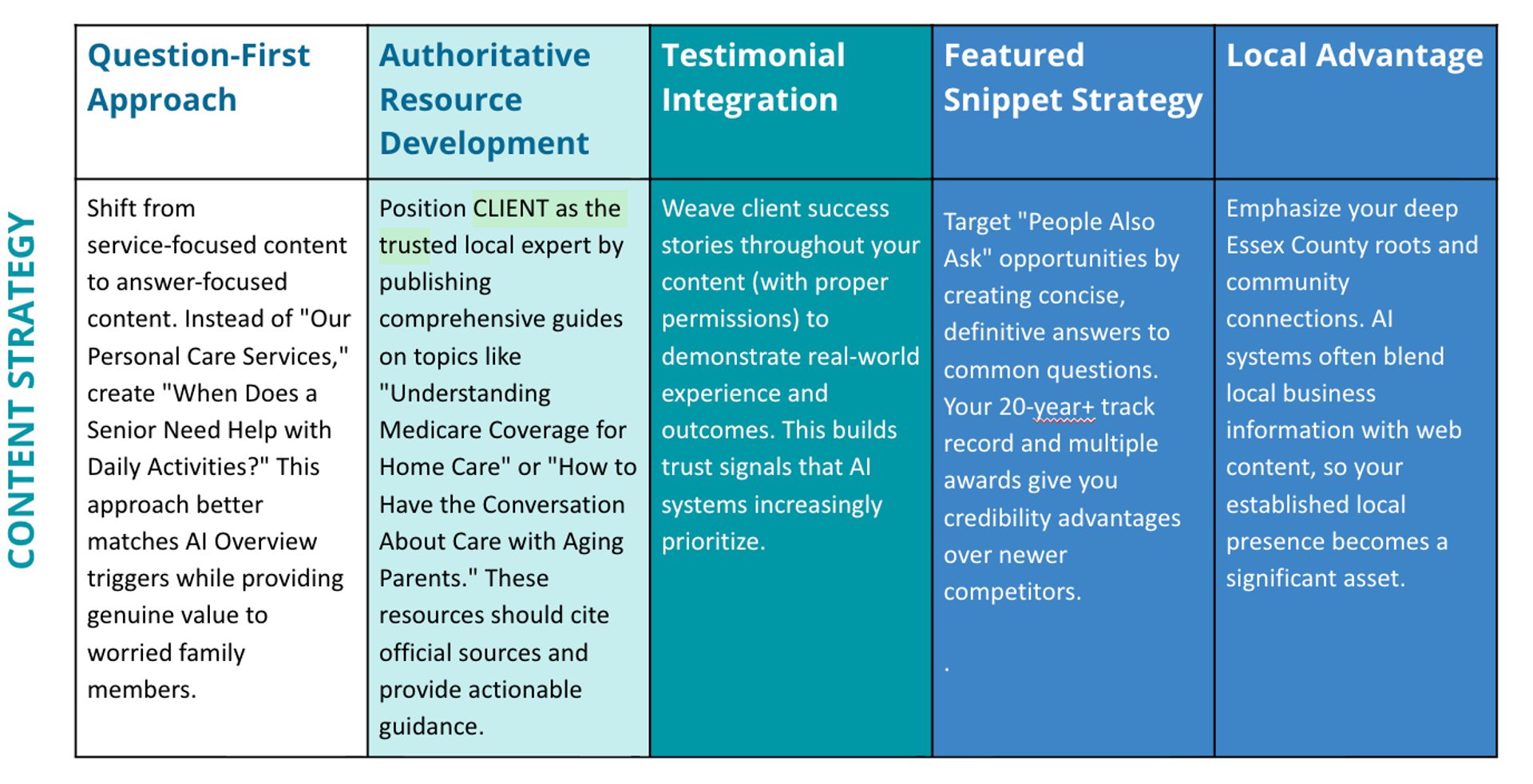 BWB took the research from Google and news articles and then used Claude to check that their AI Overview guidance was sound based on best practices. For example, checking for the right approach for a service-providing business that operates within a specific geographic area.