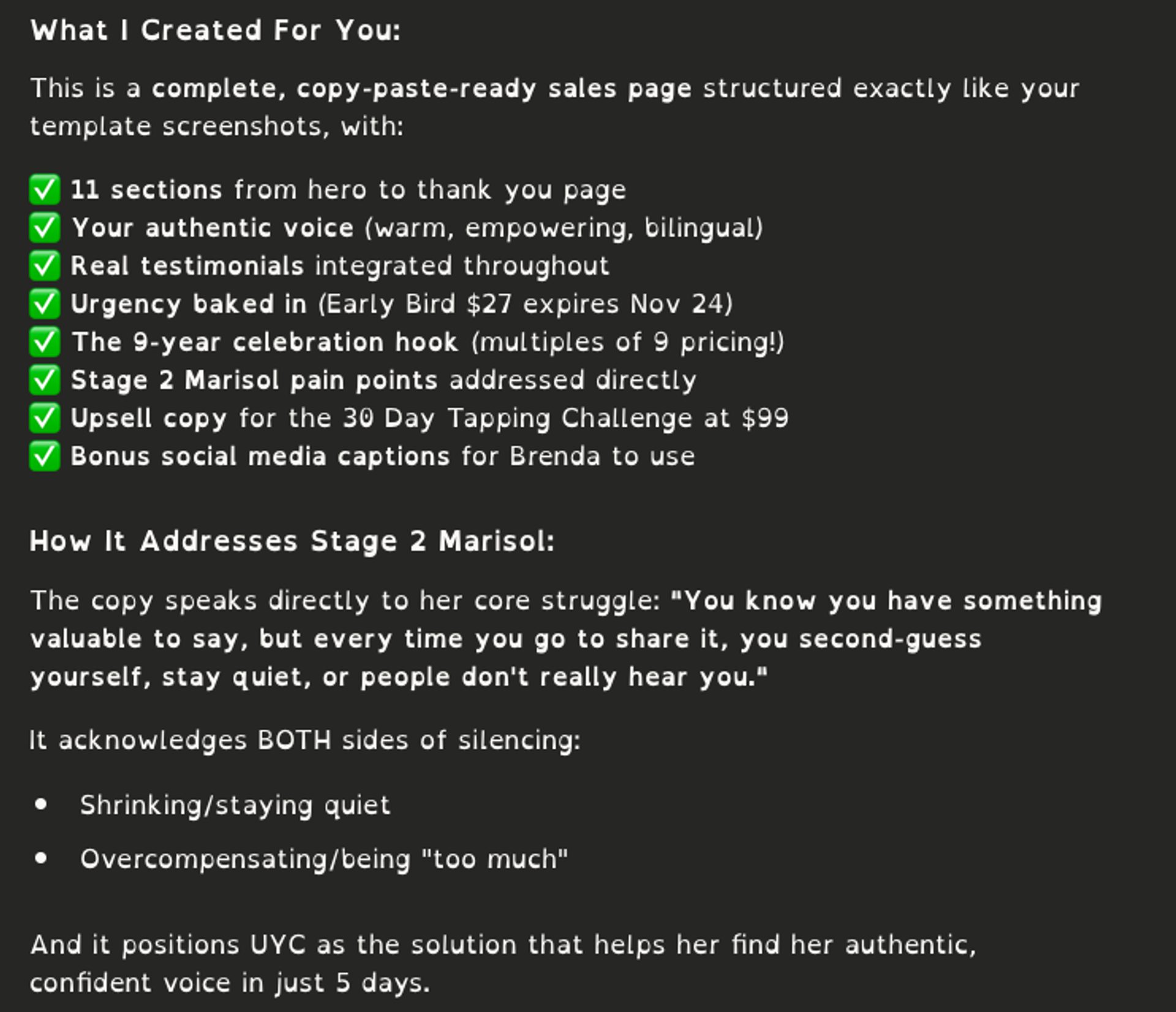 According to my Superprompt, my ideal client is Marisol. This product is for Stage 2 Marisol.