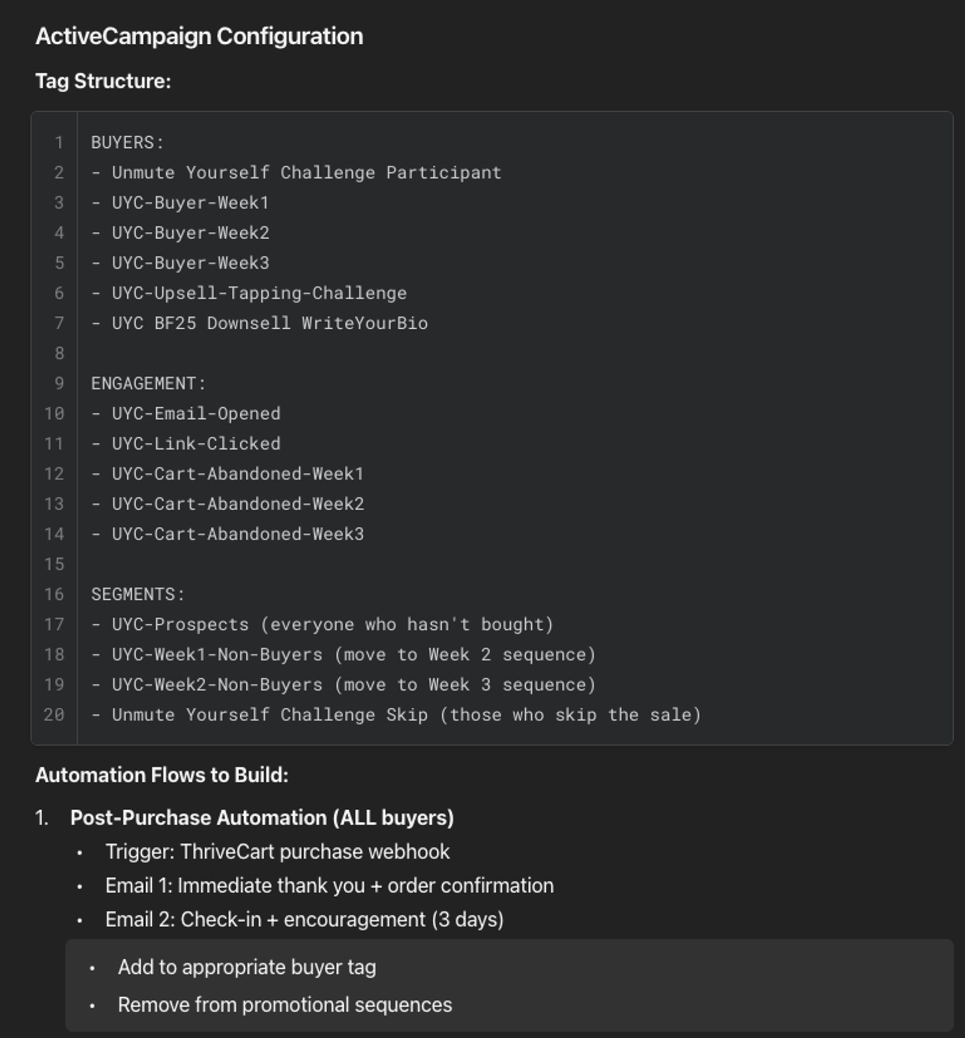 Claude even offered up a list of tags to add to ActiveCampaign in the process, which Covarrubias says saved a ton of time brainstorming and figuring out workflows.