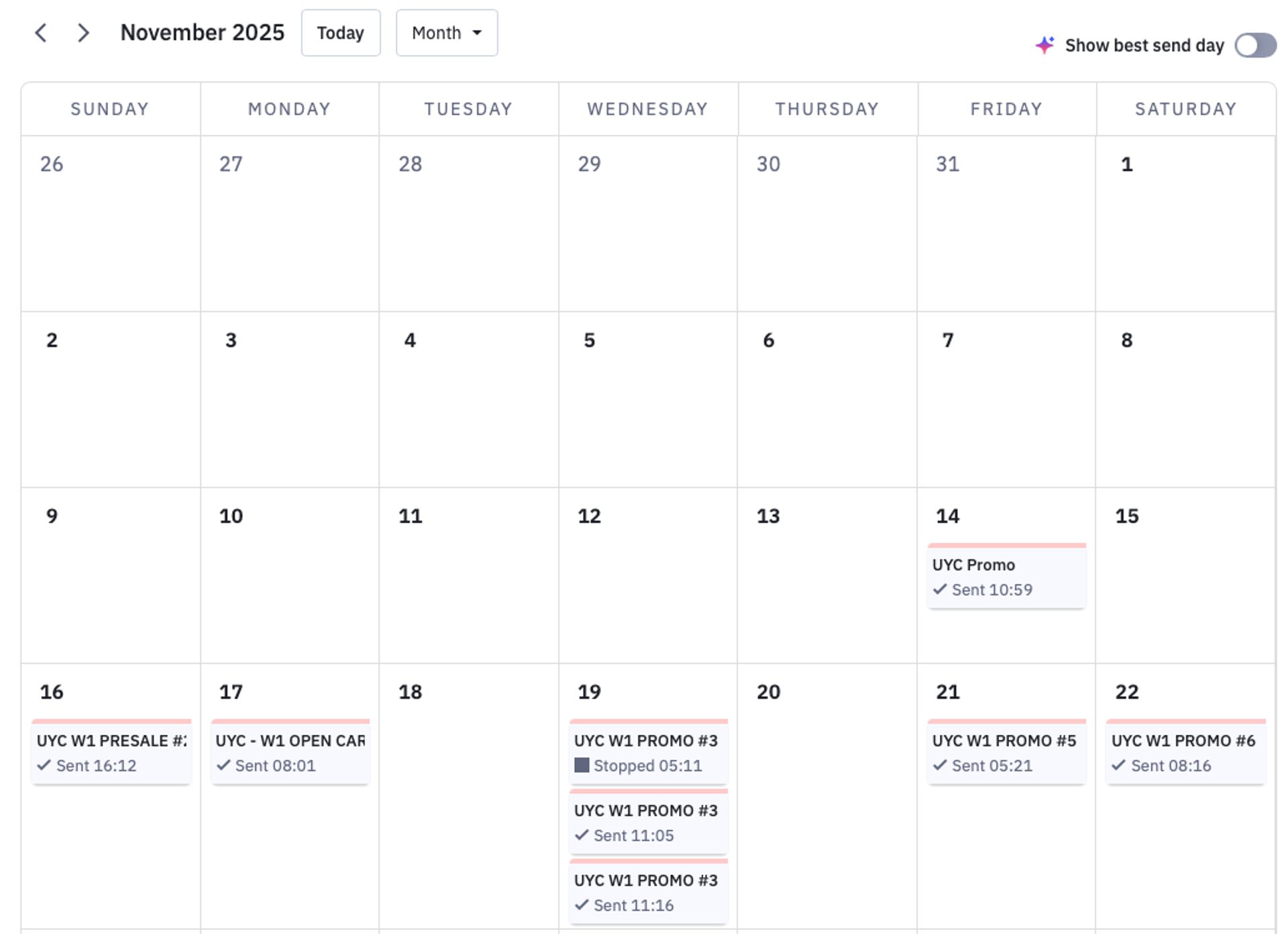 Short animation showing a snippet of the AI campaign calendar that uses ActiveCampaign's Predictive Sending feature.