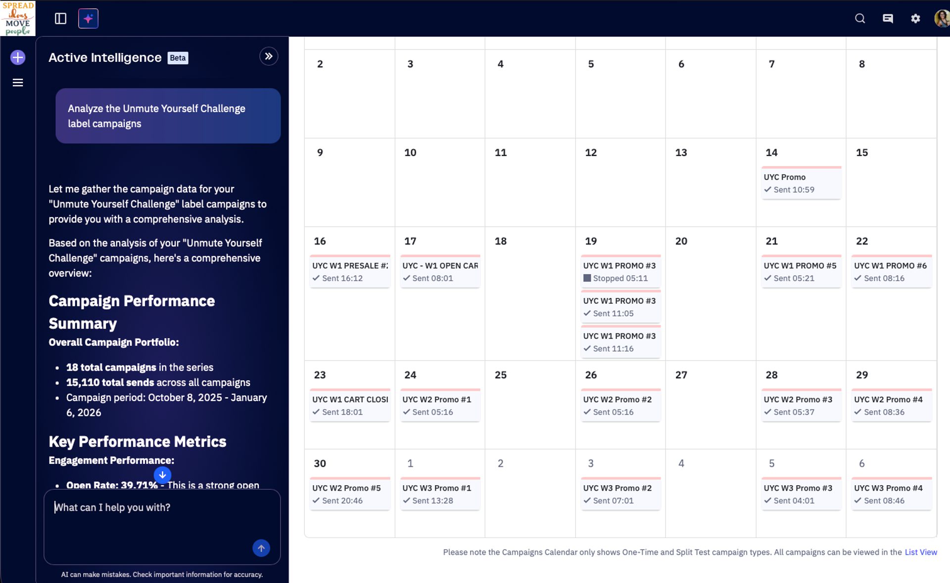 You can see in the screenshot below that ActiveCampaign’s Active Intelligence offered up some thoughts and ideas based on campaign data.