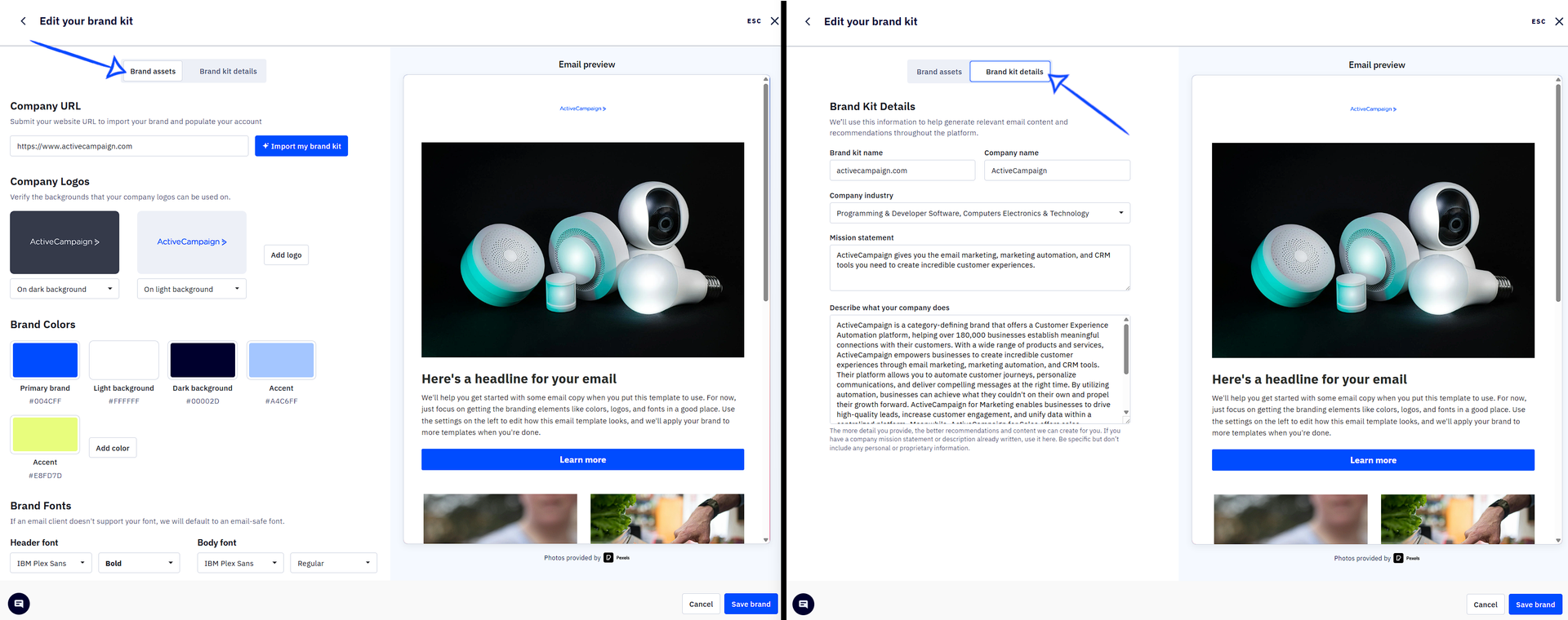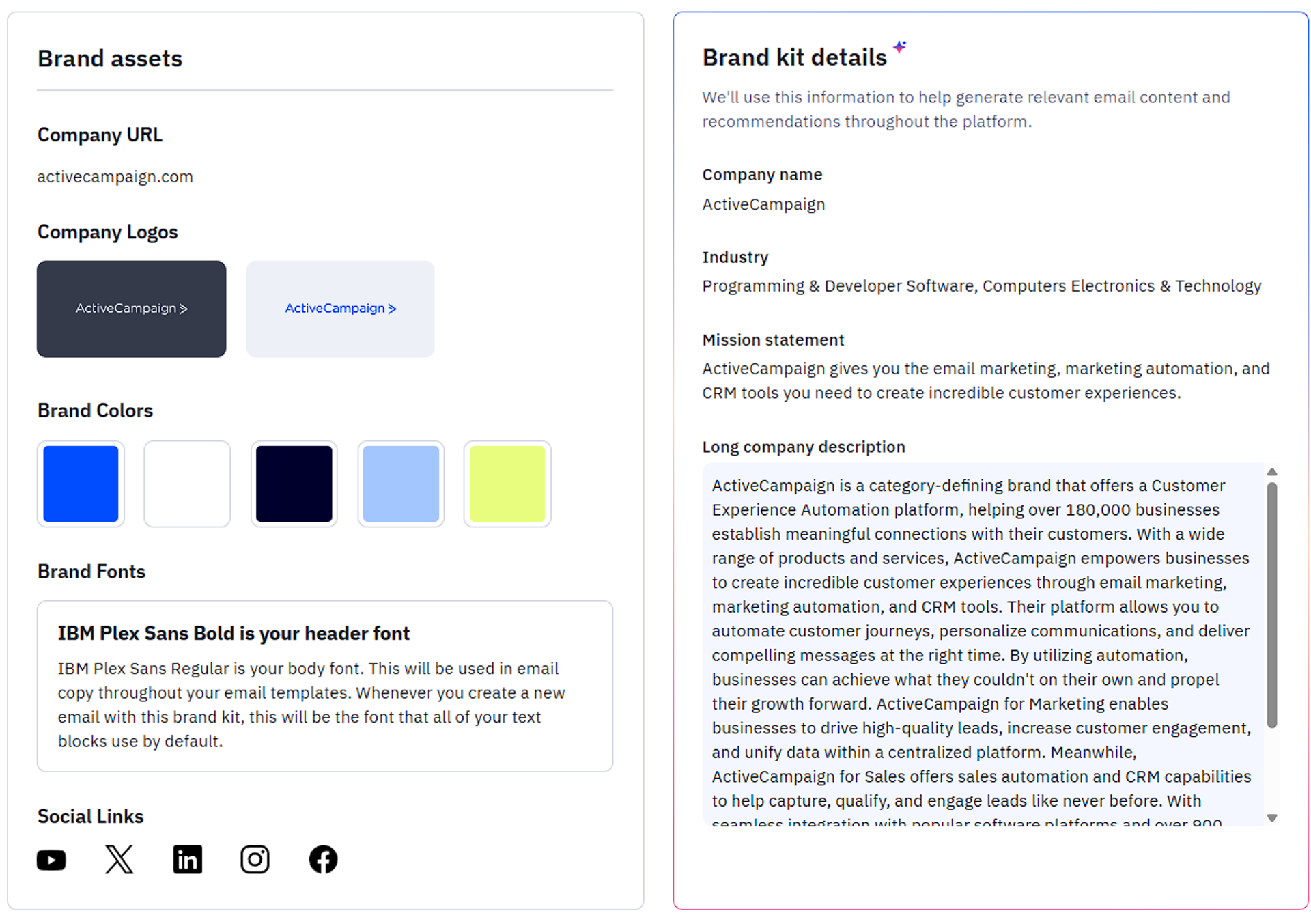 Example of ActiveCampaign’s AI Brand Kit setup.