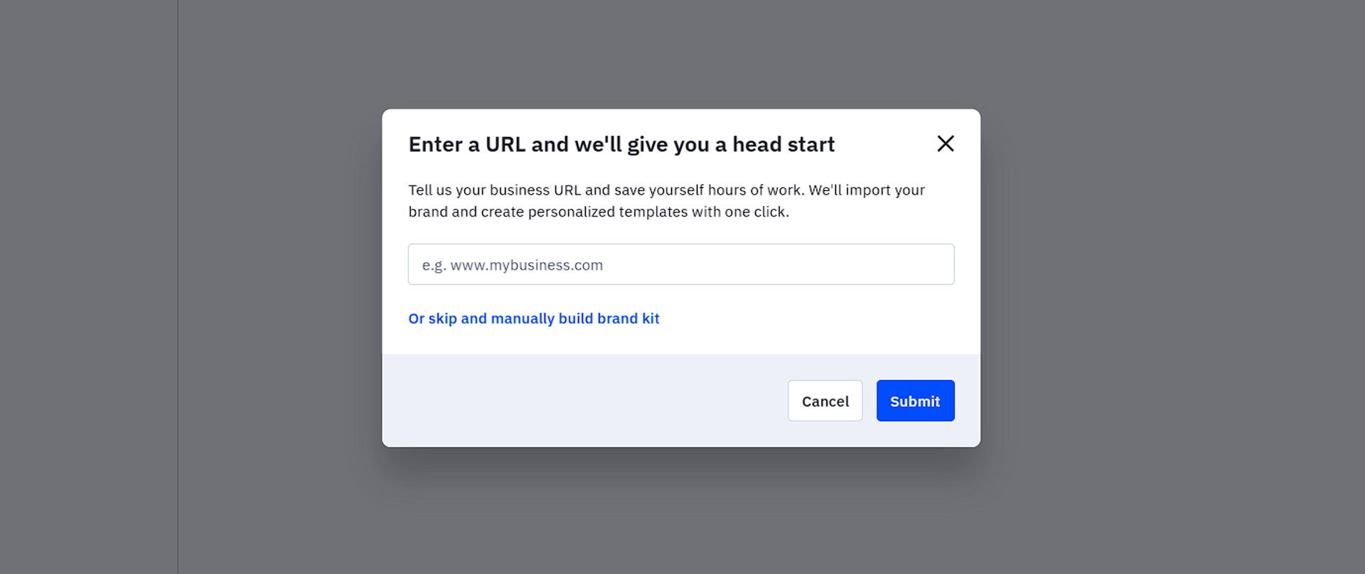 Add your website URL to import logos, colors, and fonts automatically—or build your brand kit manually if you prefer.