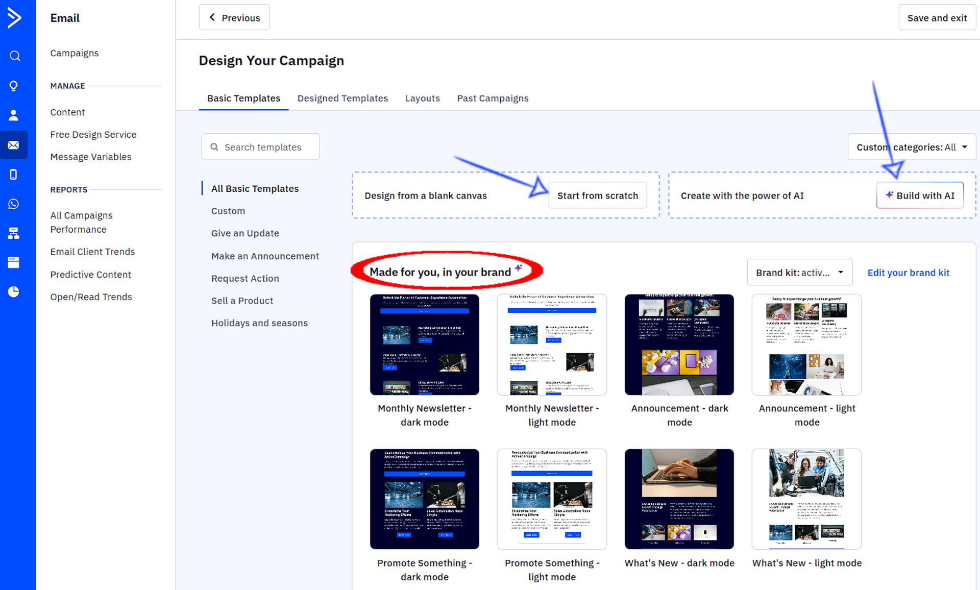 When you create a new campaign, you’ll see templates already tailored to your brand—or you can start from scratch with your branding built in.