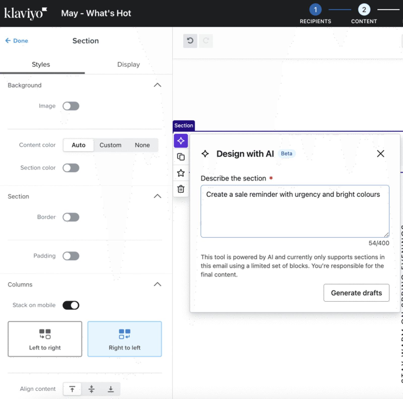 - Generative copy: Need inspiration for an email? AI can generate compelling subject lines, calls to action, and even complete email drafts with just a few prompts.