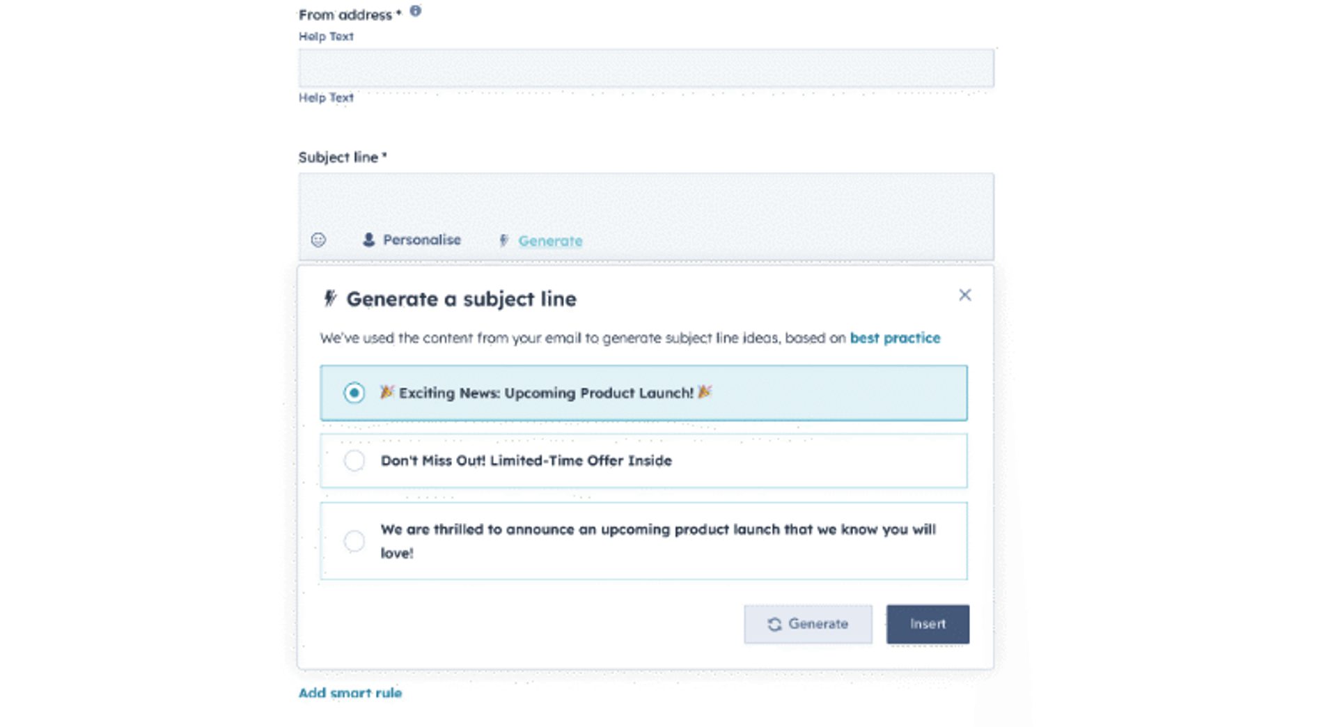 • Subject line generation: Generate compelling subject lines to improve open rates, utilizing AI to analyze and predict performance.