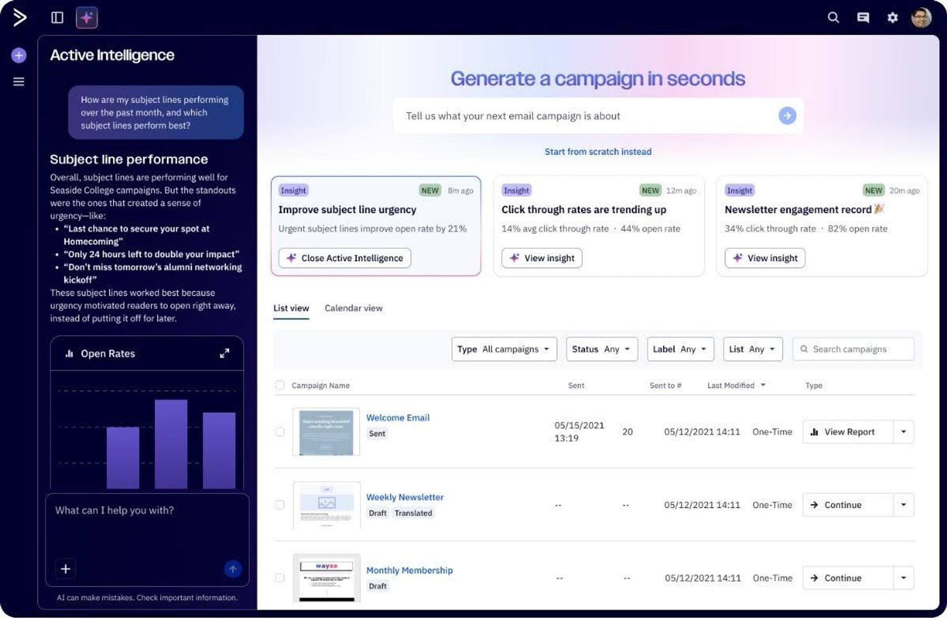 Some tools automate reporting without connecting insights to action. Others surface recommendations but require marketers to execute them elsewhere. The best tools close the loop fully within the same platform. ActiveCampaign, for example, is a fully AI-native marketing platform. The Active Intelligence AI engine runs underneath every touchpoint in the platform to imagine, activate, and validate entire marketing campaigns and strategies from end to end.