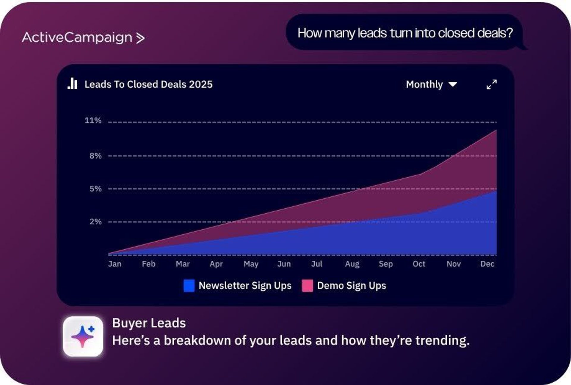 ActiveCampaign's Autonomous Insights are proactive by design. They appear directly in the dashboard without requiring a query to flag performance shifts, identify anomalies, and recommend specific next actions, often before the marketers even notice something needs improving.