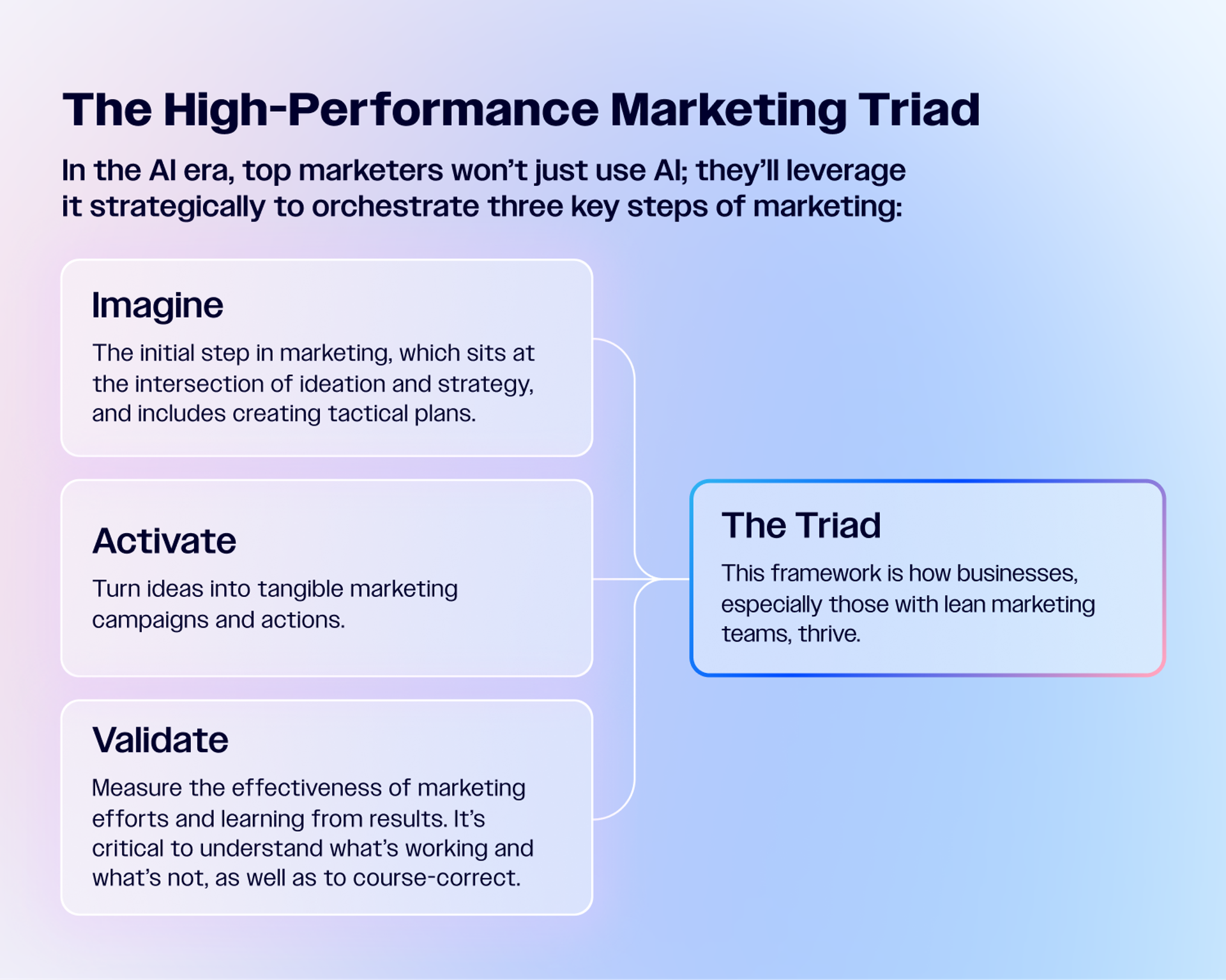Based on our customers’ AI implementation, we developed the High-Performance Marketing Triad, which is made up of three marketing pillars: Imagine, Activate, and Validate. Each is an essential component in how a modern marketer drives successful campaigns, and showcases how AI can assist at every step of the way.