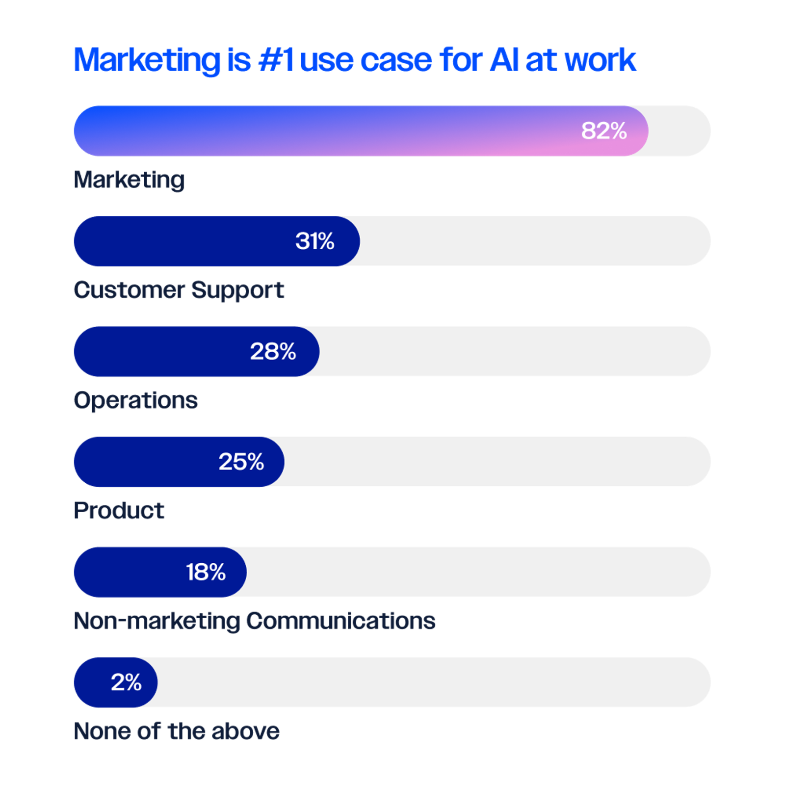 Data from ActiveCampaign shows marketing leads the way with 82% of respondents saying their business uses AI for marketing activities (ActiveCampaign). Marketers are 2.5X more likely to say they use AI for marketing compared to other areas like customer support (31%), operations (28%), or product (25%) (ActiveCampaign).
