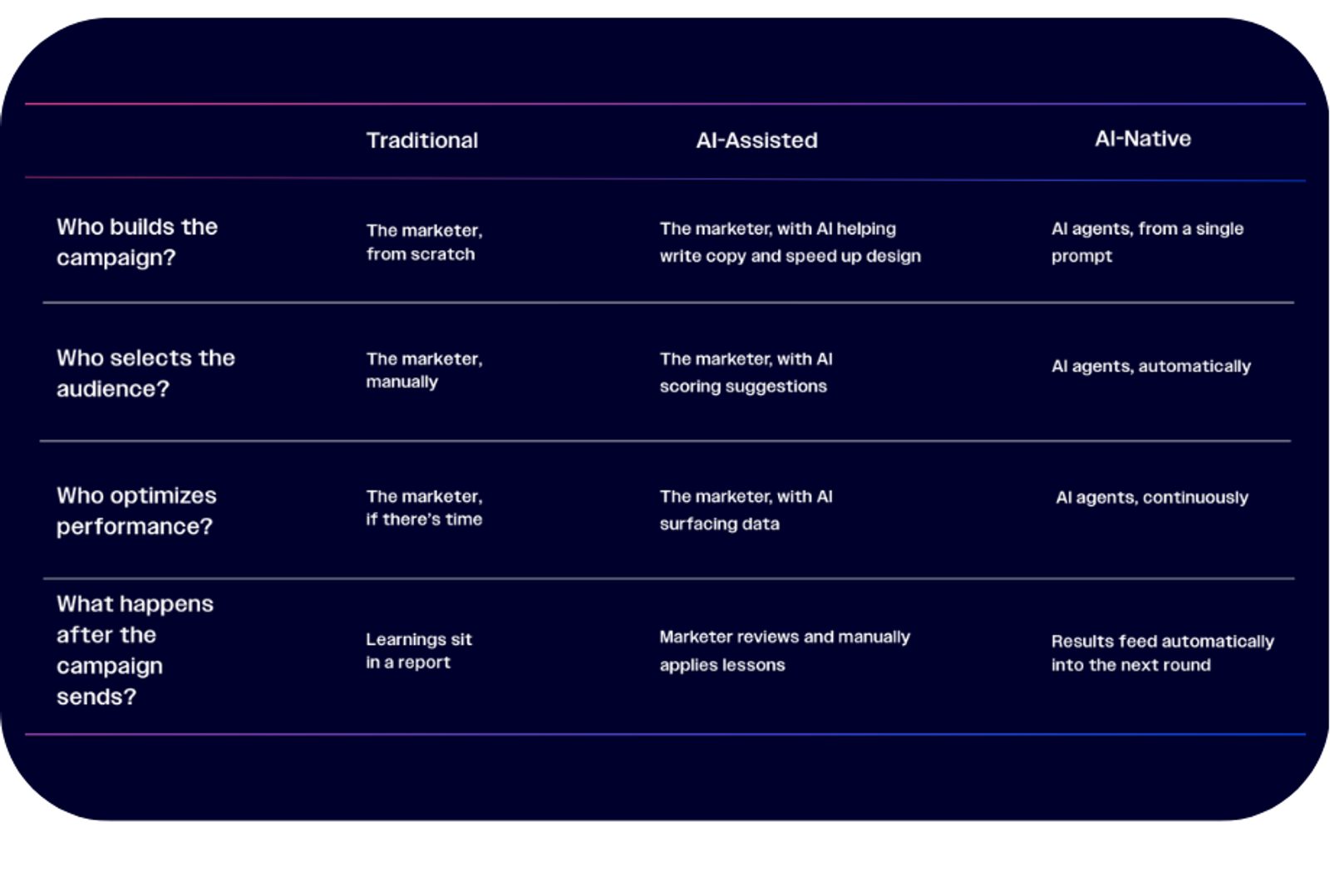A comparison table showing Traditional, AI-Assisted, and AI-Native marketing across four dimensions: who builds the campaign, who selects the audience, who optimizes performance, and what happens after the campaign sends.