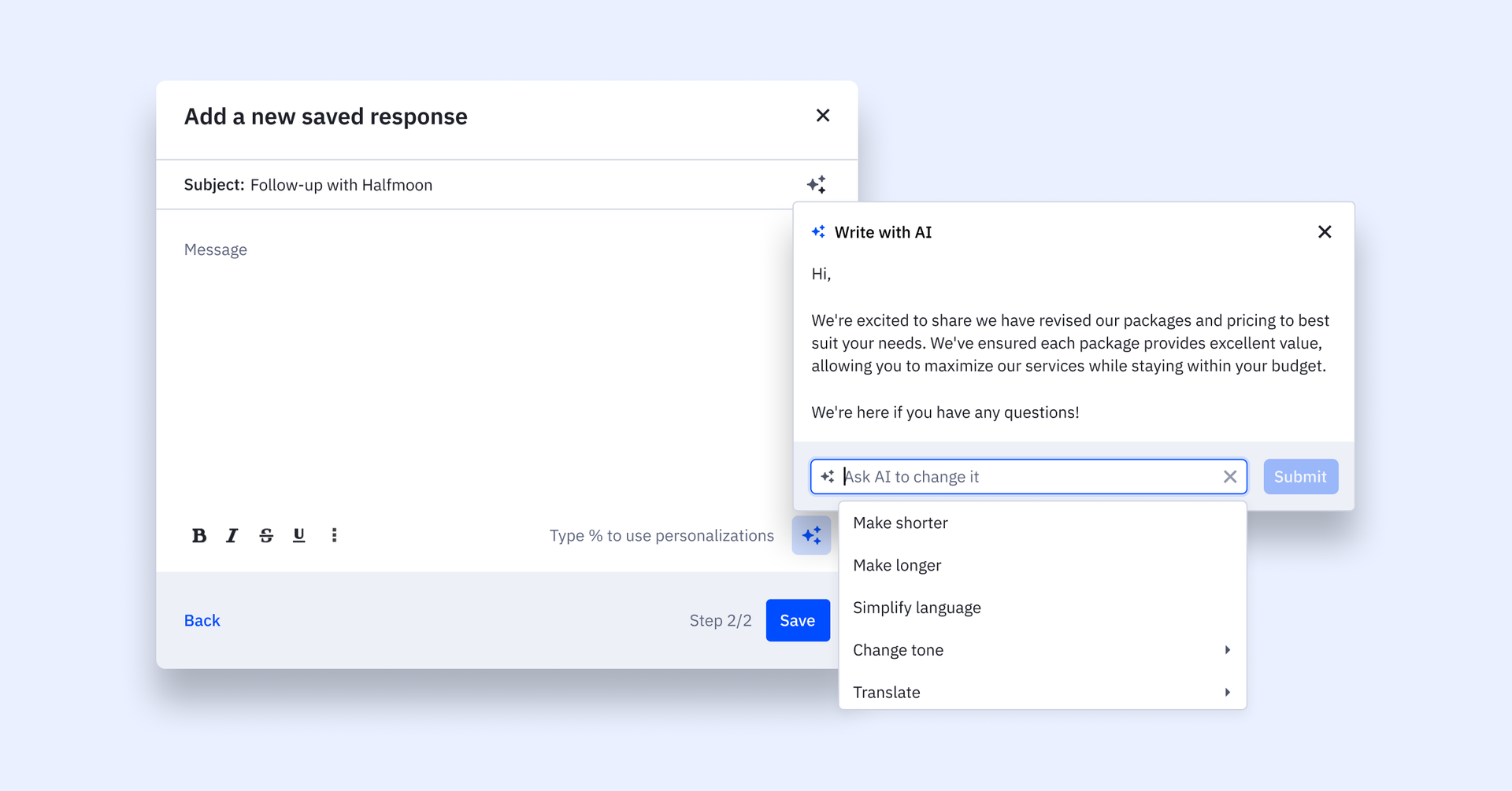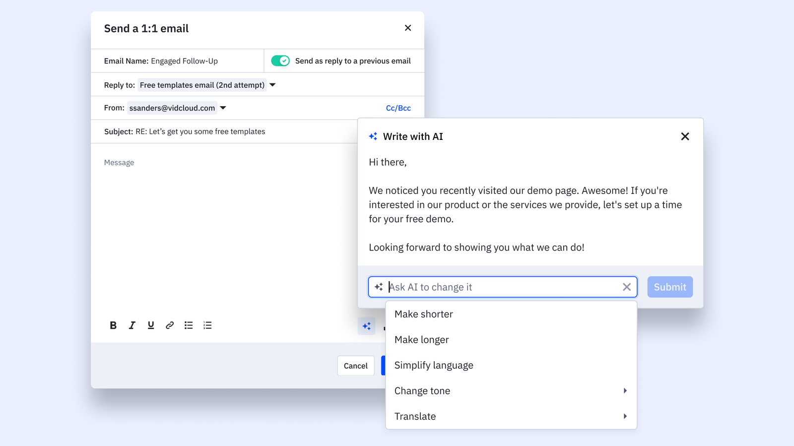In addition to using AI to generate email content for your marketing campaigns, you can now generate content for your automated 1:1 prospecting emails, standard saved responses and direct 1:1 emails sent through connected email accounts – saving you valuable time and effort.