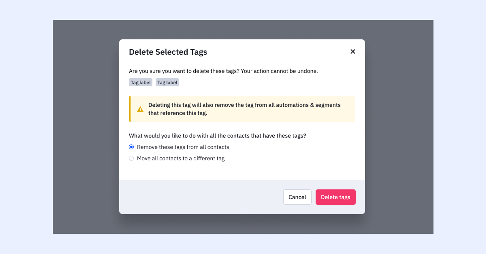 • Delete an old tag X from the manage tags page and confirm its deletion from applicable automations across the platform