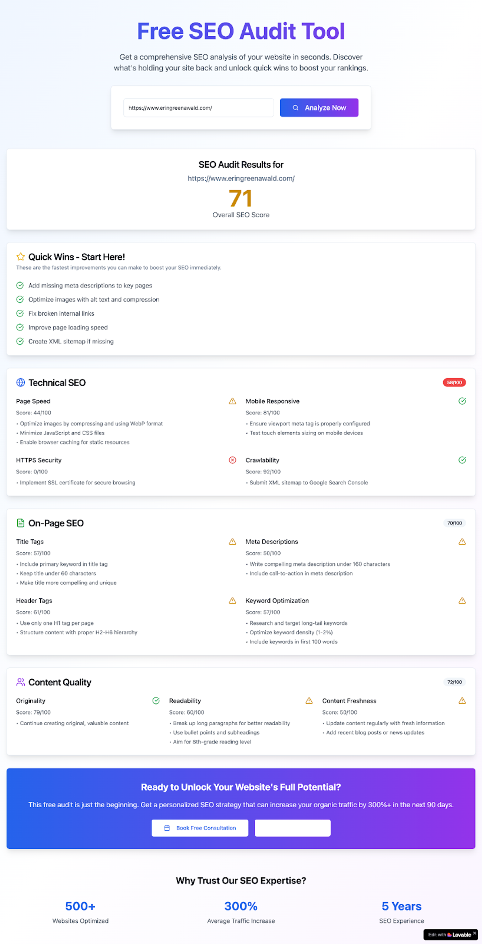 Example of an SEO audit AI lead magnet that Juyal built as a proof of concept for the AI lead magnet idea.