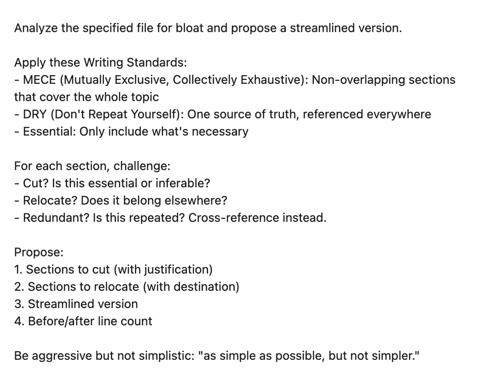 To combat slop, Metz developed a custom Claude prompt he calls an "unslop" command. It's built around three principles: MECE, DRY, and Essential.